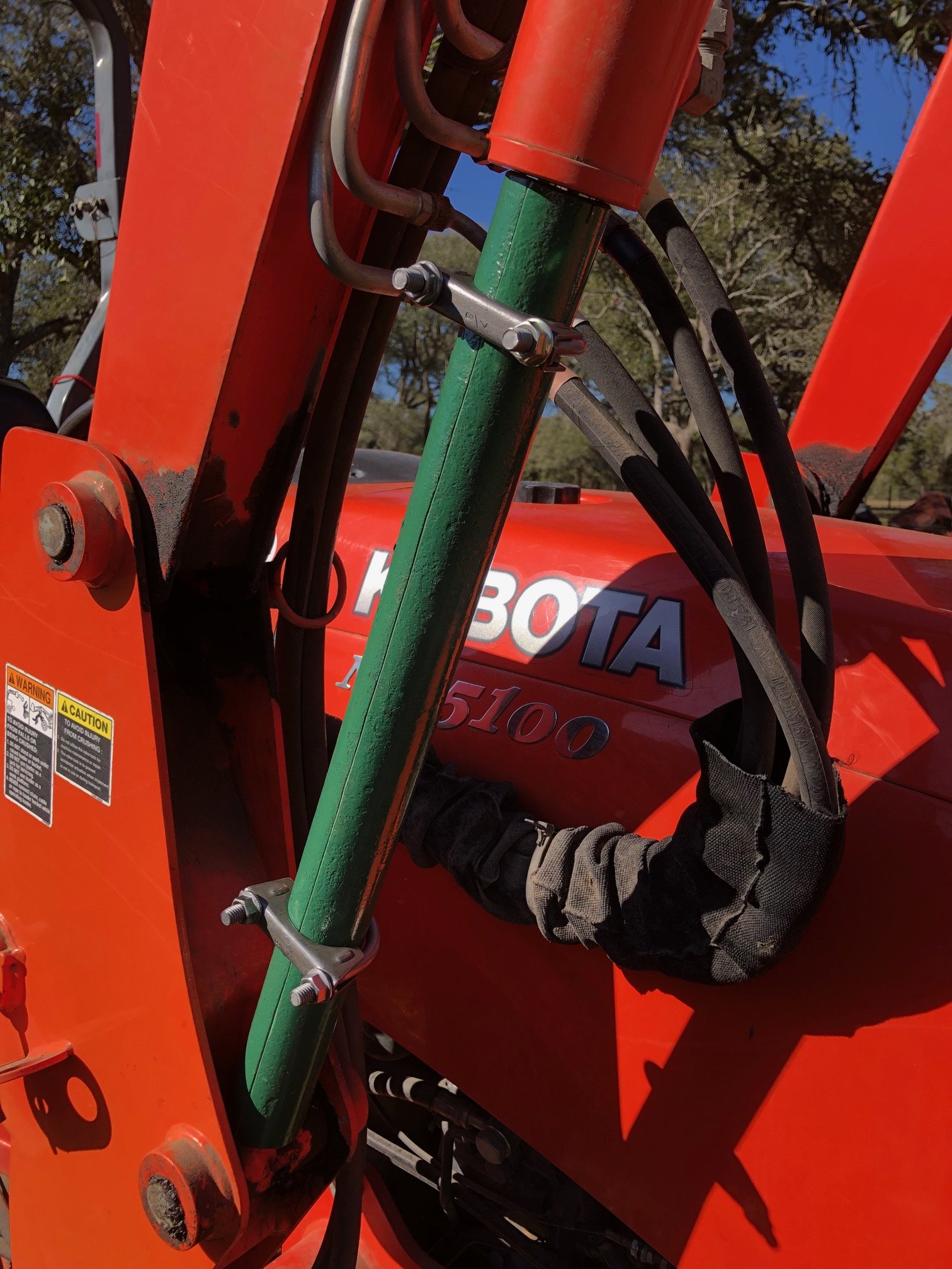 Having investigated many industrial accidental death scenes involving failed equipment, both hydraulic and mechanical caused by both humans and equipment failures, I worry about servicing my Kubota MX5100 tractor with the Front End Loader installed. To service the air cleaner, battery, checking oil and cleaning the radiator screen as well as accessing a couple of the zerk fittings, requires raising the FEL and working underneath it. So as not to have to chain the FEL up every time, I choose to use hydraulic cylinder lockout devices. So I made my own out of heavy walled aluminum pipe. The aluminum prevents scratching the chrome rams. I made two sets, one for each cylinder. I cut the pipes to length then split them lengthwise forming two matching (2) halves. I then place them on the cylinder rams and use pipe/muffler U-Clamps to assemble the two (2) halves back together. I have marked them and painted each set a different color to insure they are assembled correctly. They work great and are very stable. I have included some photos of them unassembled and assembled in place.