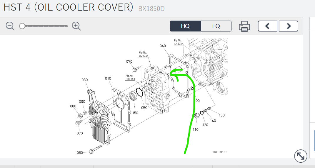 I have a BX1850 that I've operated for about 10 years now. it's always had a very slow hydraulic fluid leak, but nothing major. I would top it off every 50 hours engine time or so. The leak seemed to be on the front of the HST, somewhat let of center (left from point of view of operator sitting in the seat). Last week, after mowing, I noticed a dramatic leak, about the rate of what would come out if you tipped a beer bottle on its side. Same location, I think. I removed the ROPS, seat, fender, floor to get a better look. No obvious ruptured hoses or fittings.