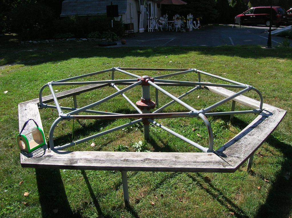 The merry-go-round was just like the picture below. A kid with strong legs could stand in the center and get it going fast enough to make the kids on the seats scream (and a few times even fall off).