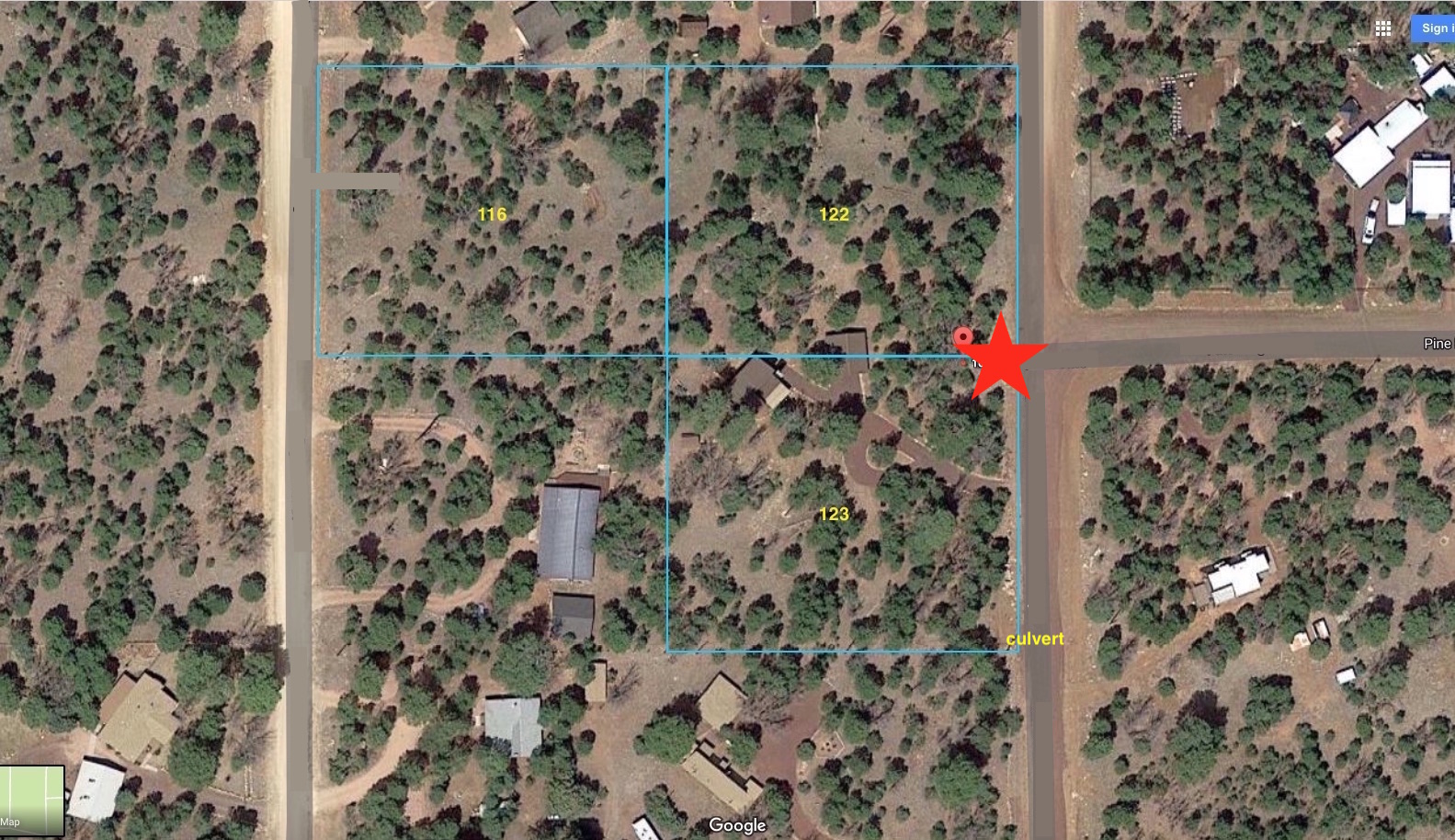I say knew, because the county culvert at the corner of the property plugged up, causing a huge monsoon rain runoff to backup & flood the area across the road from my driveway. When the water got high enough to reach the crown of the road, the road washed out to a depth of 5+ft, and 3-8ft wide, right at the point were my center pin was. (red star)