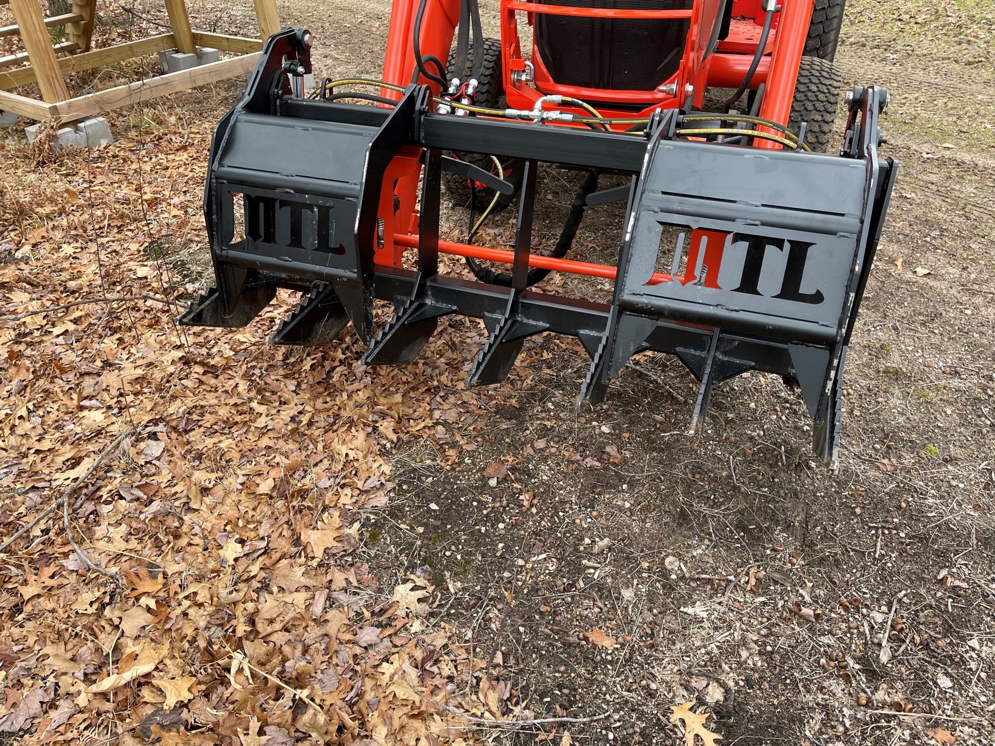 Here is 900# well forward of the pins - 525# grapple and 375# log). I had to curl to get the log to the back of the tines to lift it. Not quite full height since I am not comfortable with that big over hang at that height but it showed no reluctance to going higher.
