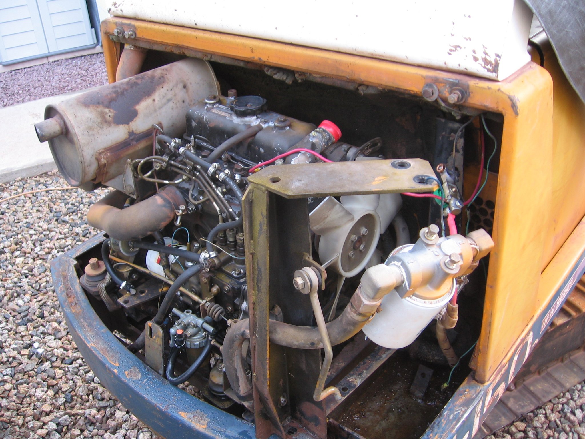 Pulled the engine cover for better access. Spent hours trying to figure out how to pull the radiator, finally succeeded once I figured out where all the bolts where. The radiator support, held in with (4) bolts, none visible under all the dirt, also supports the hydraulic filter. Hydraulic line goes through the support, (poor design, can't pull the support without breaking the hydraulic circuit) and the radiator & shroud is bolted to the support with (4) bolts, none visible under all the dirt. Radiator drain cock was broken off as I suspected, but came out easily with a LH drill. I had a couple new ones on hand, so easy fix there. Radiator has no leaks. Upper, lower, & bypass hoses all recently replaced, but clamped with wire hose clamps, which will be replaced with worm drive band clamps.