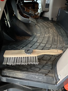 I just installed an inexpensive broom with a magnet to grab and keep the mat clean. This can also double as a grill cleaning tool when brush cutting. Visibility is not affected at all with this storage location. I was wondering what others have used to keep their cabs clean?