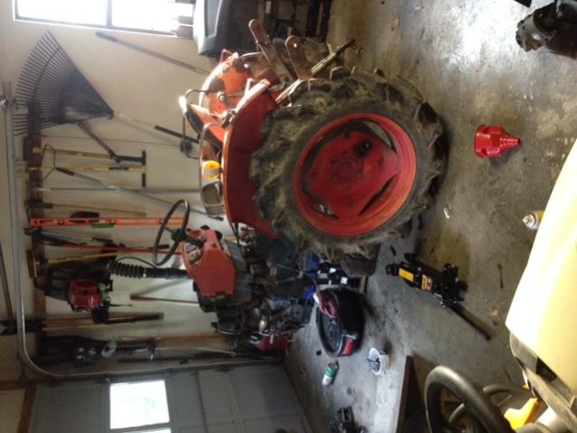 I started out by removing the radiator and fan shroud. It's not required to remove the front end, but in my case I wanted to flush it also. Jacked the tractor just behind the oil pan, leaving enough room for jack stands, and just enough to take the pressure of the front end. Removed the five bolts for the front end, and disconnected the steering linkage. Then rolled the front end out of the wayhttp://www.orangetractortalks.com/forums/attachment.php?attachmentid=11720&stc=1&d=1401570384