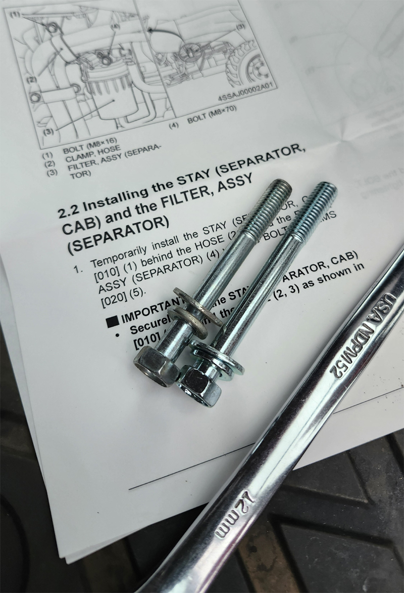 I installed the kit on my MX this morning. Access is a bit of a challenge but I figured it'd be easier to struggle for a bit rather than take off the loader and disconnect hydraulic hoses. The photos below show the before and after (some taken through the front glass), and the difference in the bolts used which have grown to accommodate the thickness of the bracket. I just noticed that I need to rotate the hose bracket a couple of degrees. 😂