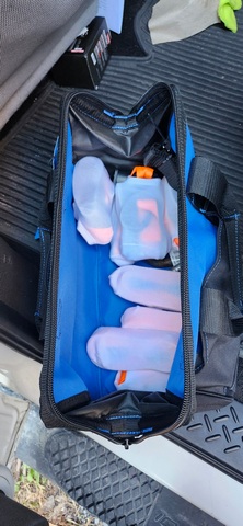 I bought some new lightweight straps for my new (to me) pickup, and I wanted to find a way to end the strap madness. A tool bag from my local Big Box was part of the answer. The velcro ties on the end of each strap were another part of the answer. They work well to keep rolled straps rolled up.