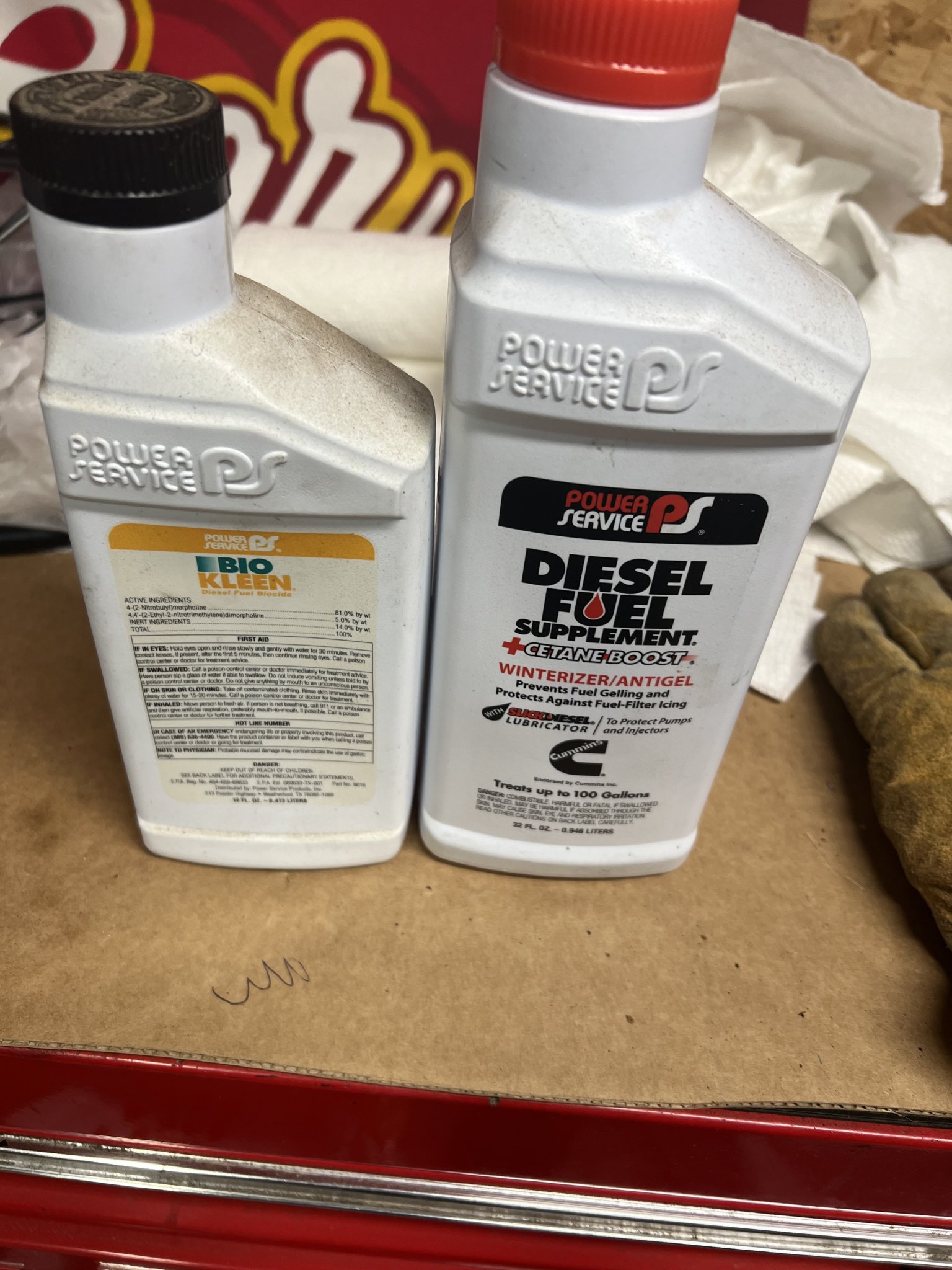 Left is a biocide. Right is a supplement to boost cetane, lubricity, and help with gelling for winter months. I use a similar product in a silver bottle during the summer.