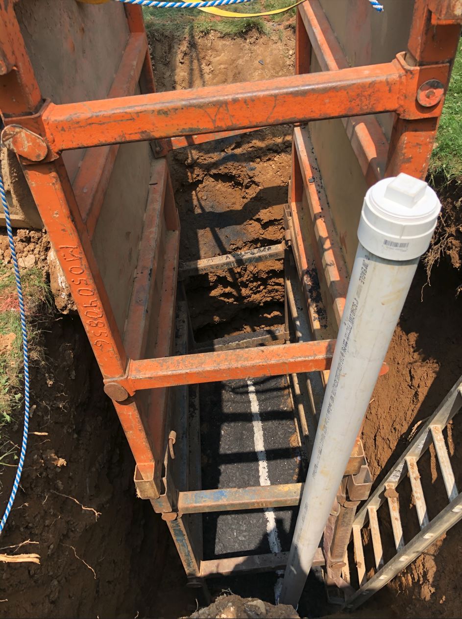 Sewer line repair to retrieve a stupid cap that plugged the line. I was told that we'd be down 11 plus feet, so we went with a rented orange mule and some trench boxes. Turned out to be only 9 feet down, but it still made for an impressive mound of dirt. Oh, and the rented mule came with an 18" bucket! Not what was ordered. Oh well.