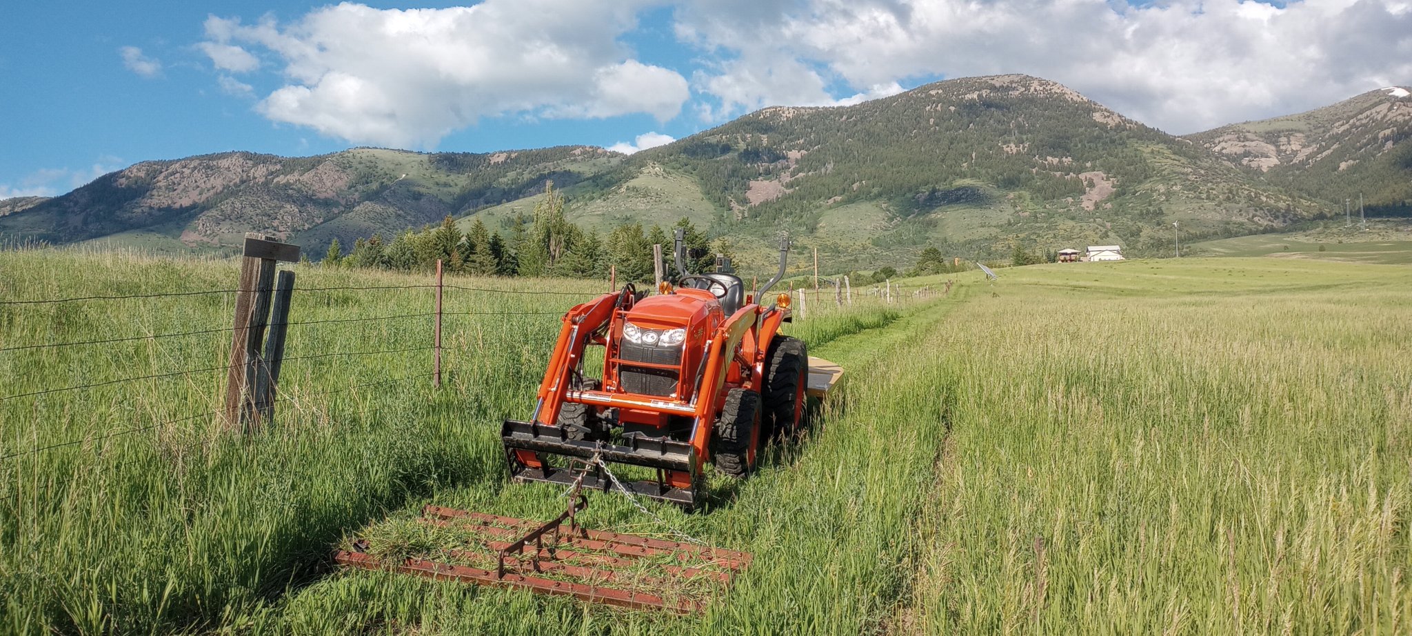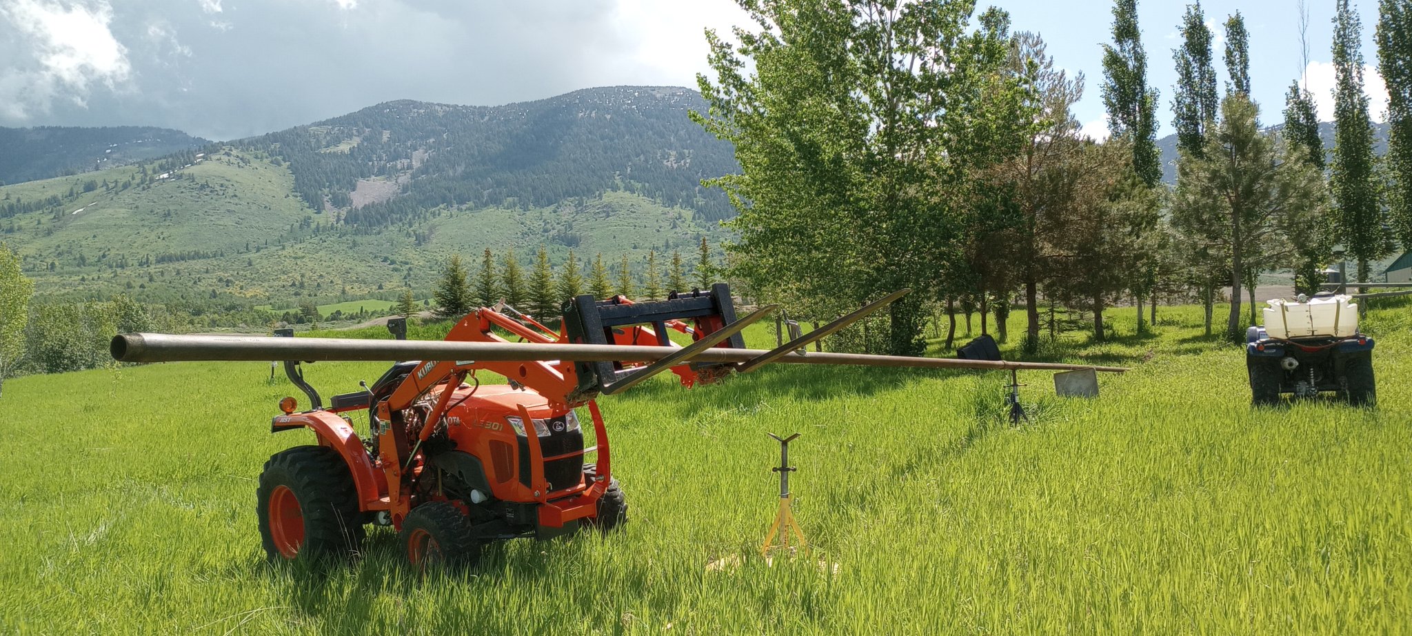 I did something new today, used the FEL and the Q/A frame to hoist the harrow, WHILE also mowing. Didn't want to make two trips (1/2 mile), so mowed backing up, while also dragging the harrow. This gave me the option of lifting it clear up while going across my driveway and other areas not needing harrowed. This will be my new way to harrow, mower or not. Then I positioned (2% grade, down) 60' of drill pipe that captured my spring water, which originates 300' lower and 2000' away, and is pumped into a 2100 gallon storage tank at the highest end of my 70 acres. The tank has an overflow, and thanks to the fall of the property in 60' it exits the pipe about 5' off the ground. A water wheel, (using some 5' 100 year farm implement iron wheels), or a Japanese deer chaser, (a giant sized one, not of bamboo but 6 or 8" pipe)may be in the works, just as a hoot and also an easy to eyeball indication that the tank is full. With my "spring re-location" project in it's first summer, I have 3 to 4 K gallons of water to play with, every sunny day, and also am wrapping up an extensive irrigation project.