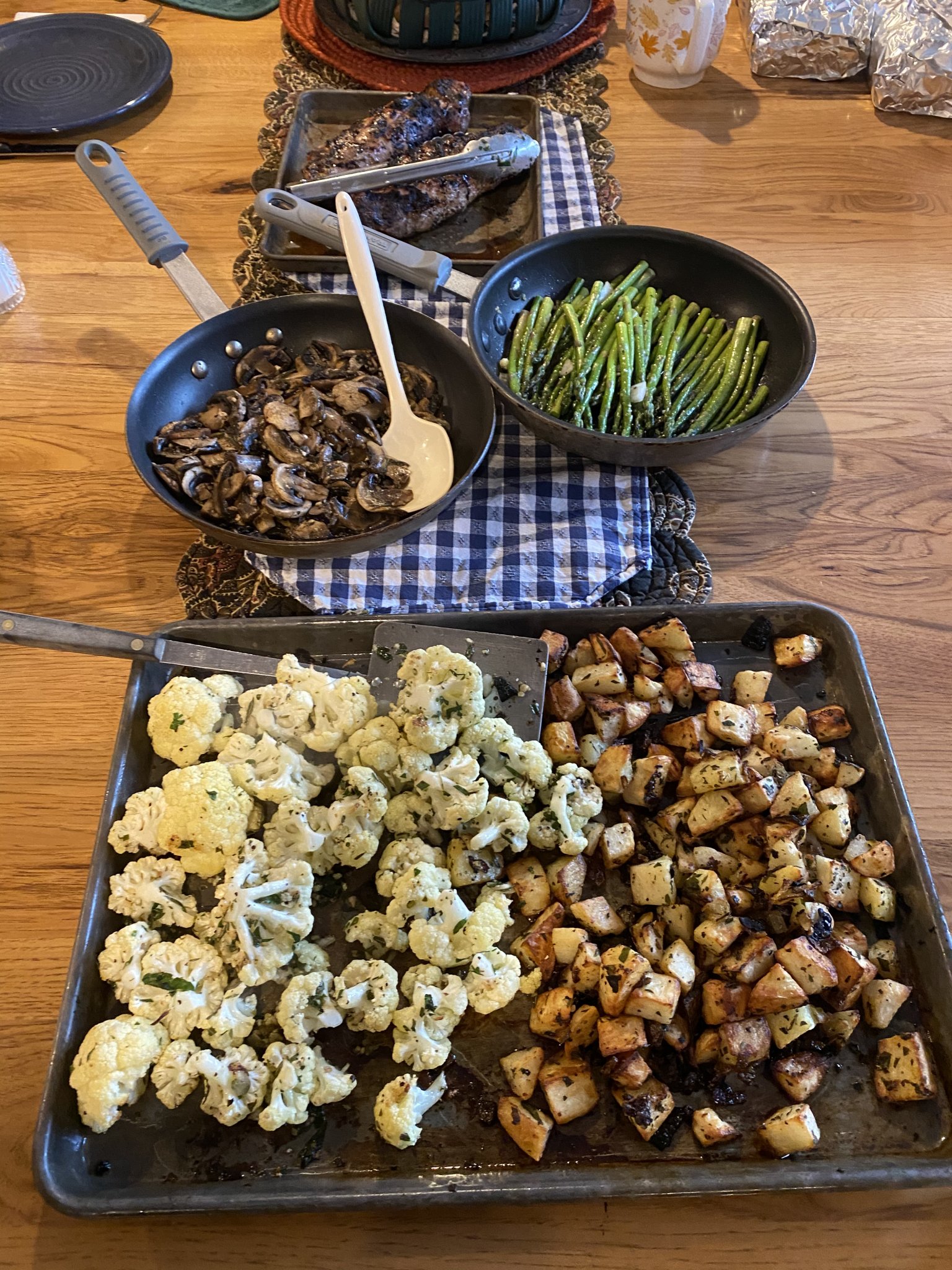 I was remiss; pork tenderloins with ethyl mercaptan, fresh rosemary and garlic, along with fixings. Roasted the taters and cauliflower in the oven with a little rosemary, parsley and garlic too.