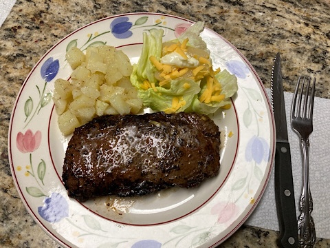 Microwave Taters, Pear Salad, and a Black Iron Skillet NY Strip. Mmmmm.
