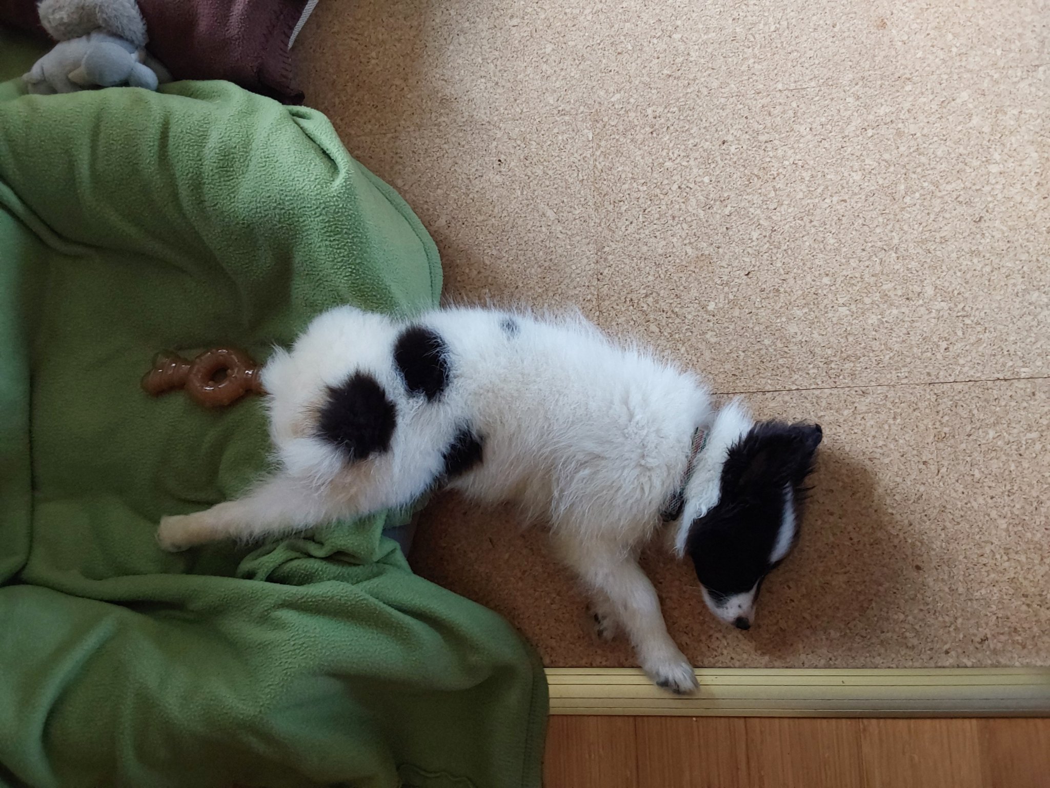 New puppy today. Lost our old girl several weeks ago and have never been without a dog before. Our local rescue Lollypopanimals.org raided a puppy mill home with 120 dogs several weeks ago. Recently got the legal right to adopt them out. Well this morning we took a ride and a puppy picked us to be part of her family. Almost 3 months old and part Border Collie. What a smart puppy . She tired herself out exploring the world and crashed hanging out of her bed.