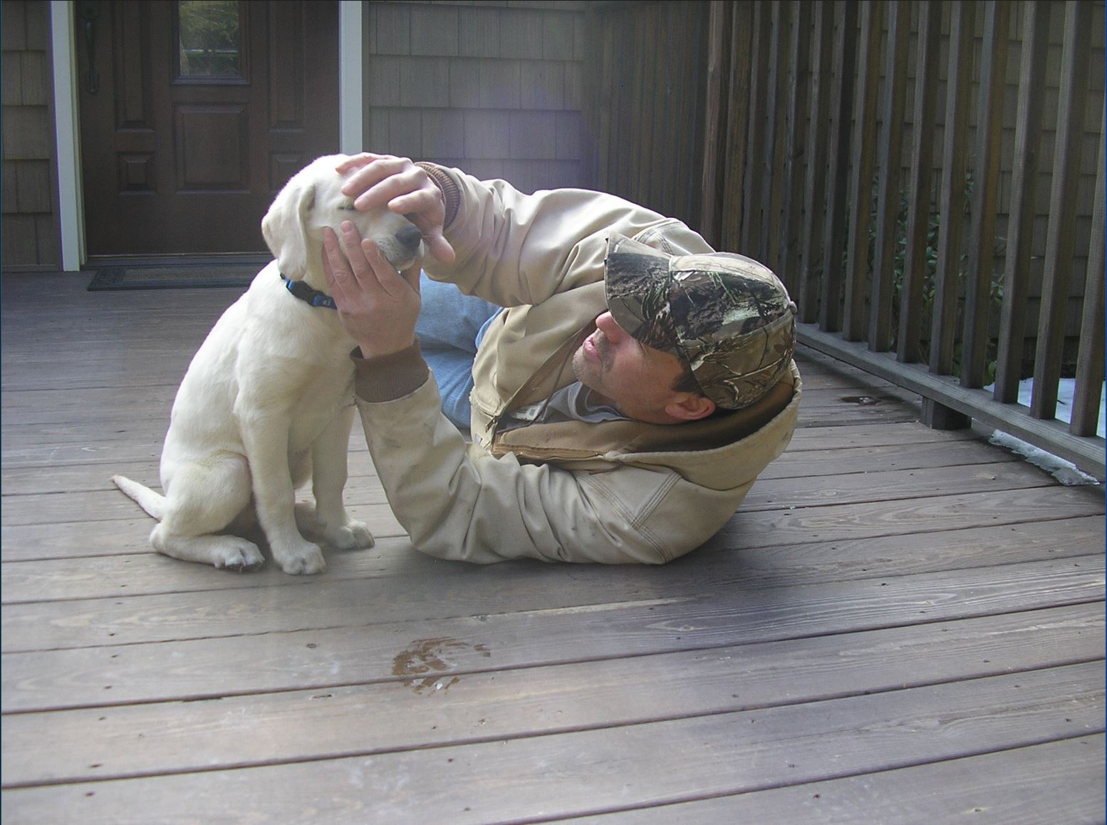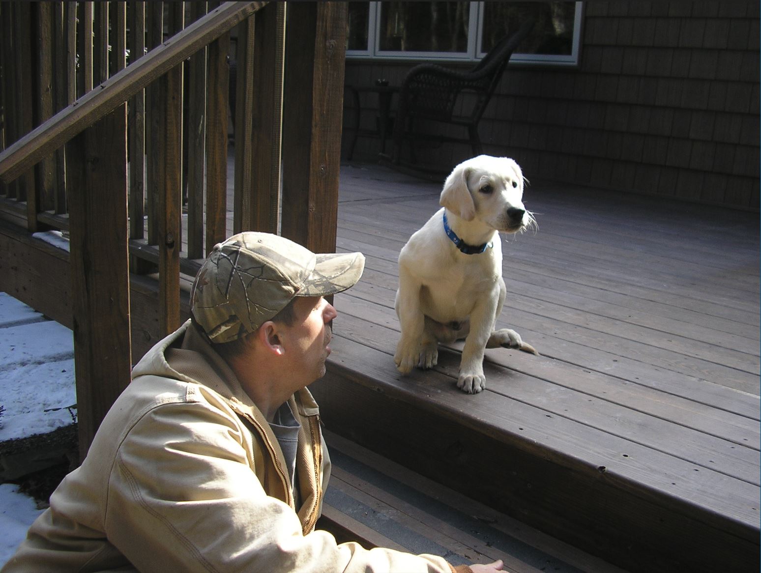 We decided to take him back to our previous house for what may be his last swim. He spent the first 4 years at this home and it's wonderful swimming opportunities. Took a picture with him at our old house on the same porch as his first day with us 11 years ago.