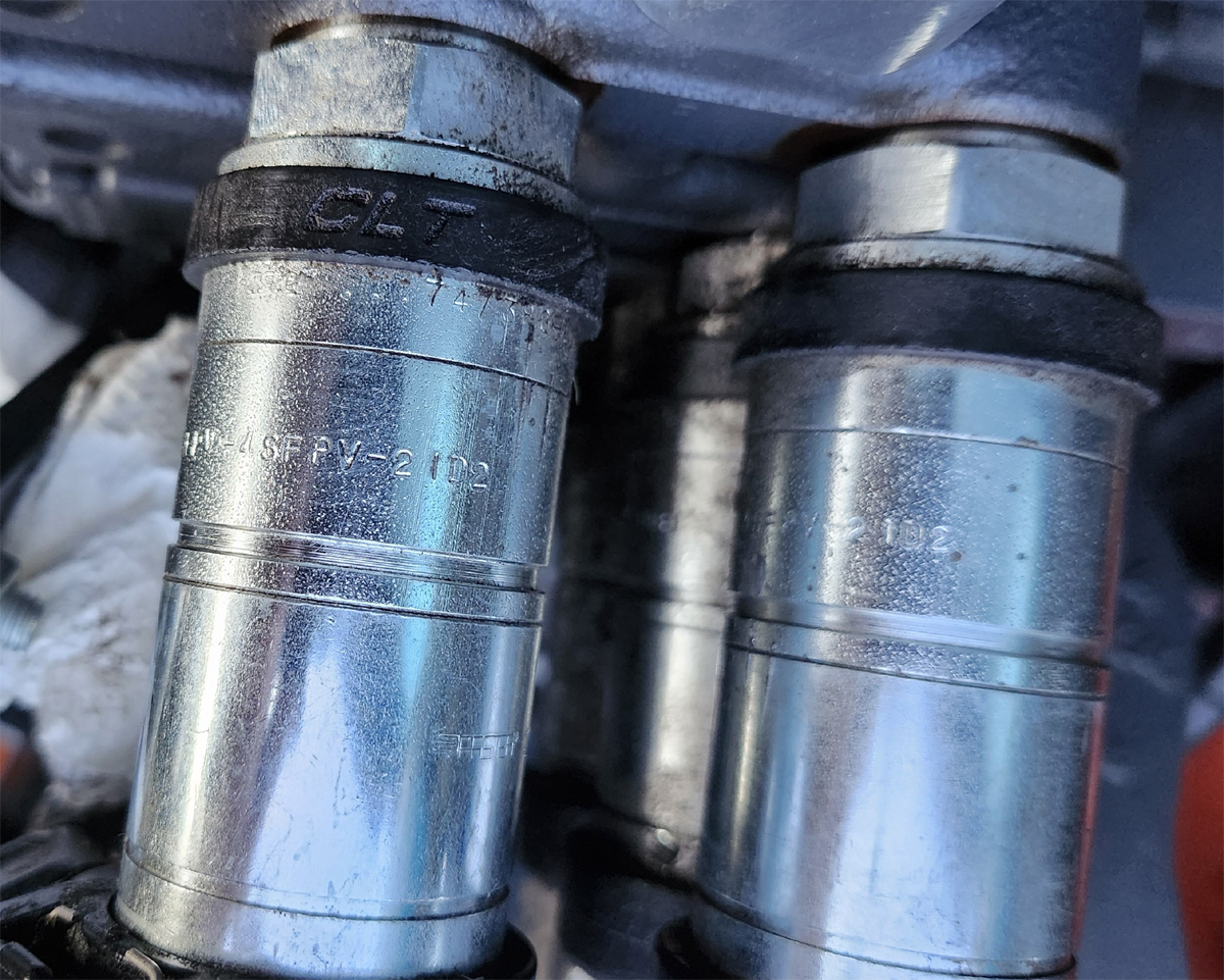 The couplers are Faster 4SRHF one hand push/pull couplers and can be connected and disconnected under full system pressure up to 3600 PSI. No more fighting with residual pressures.