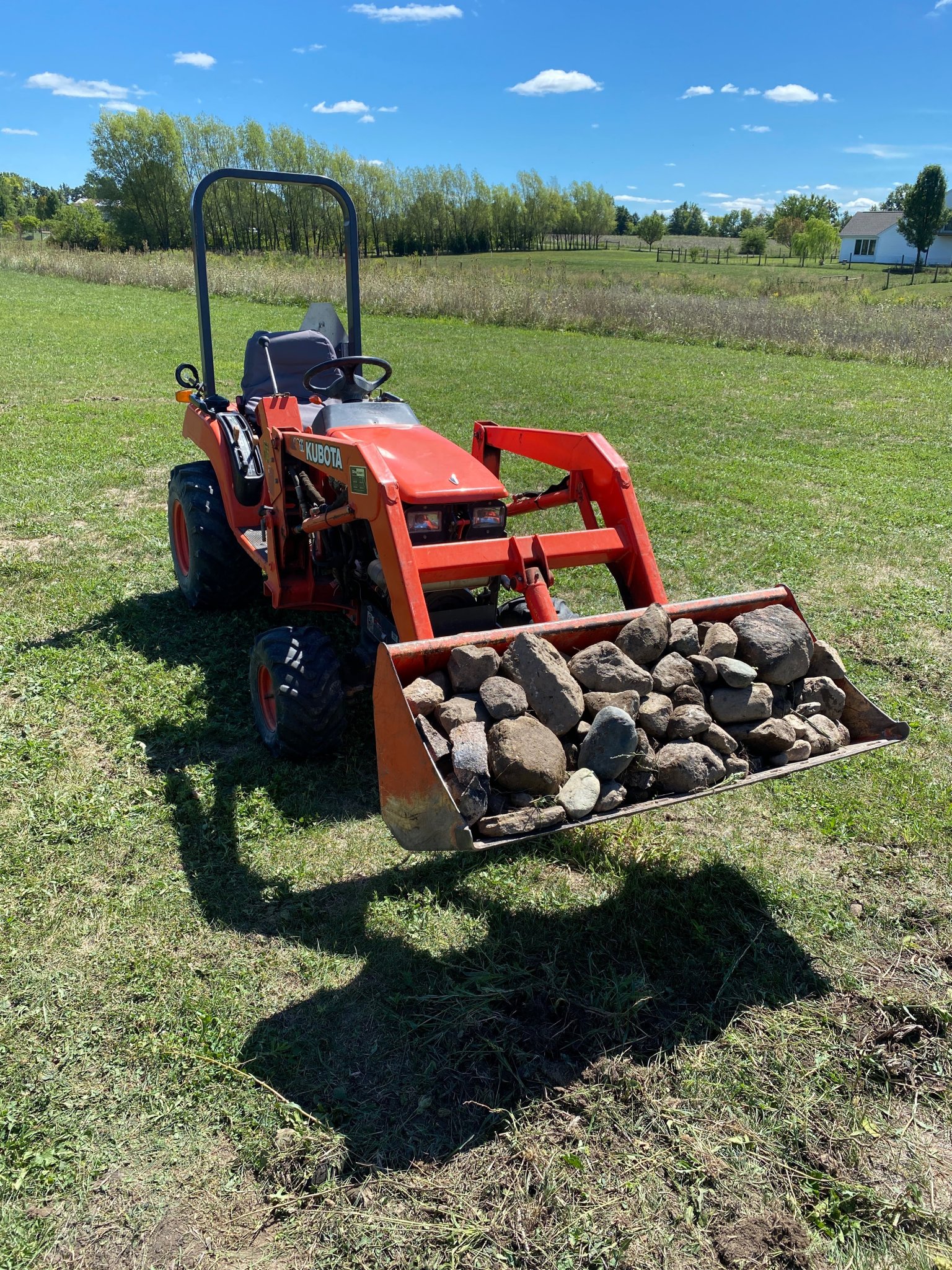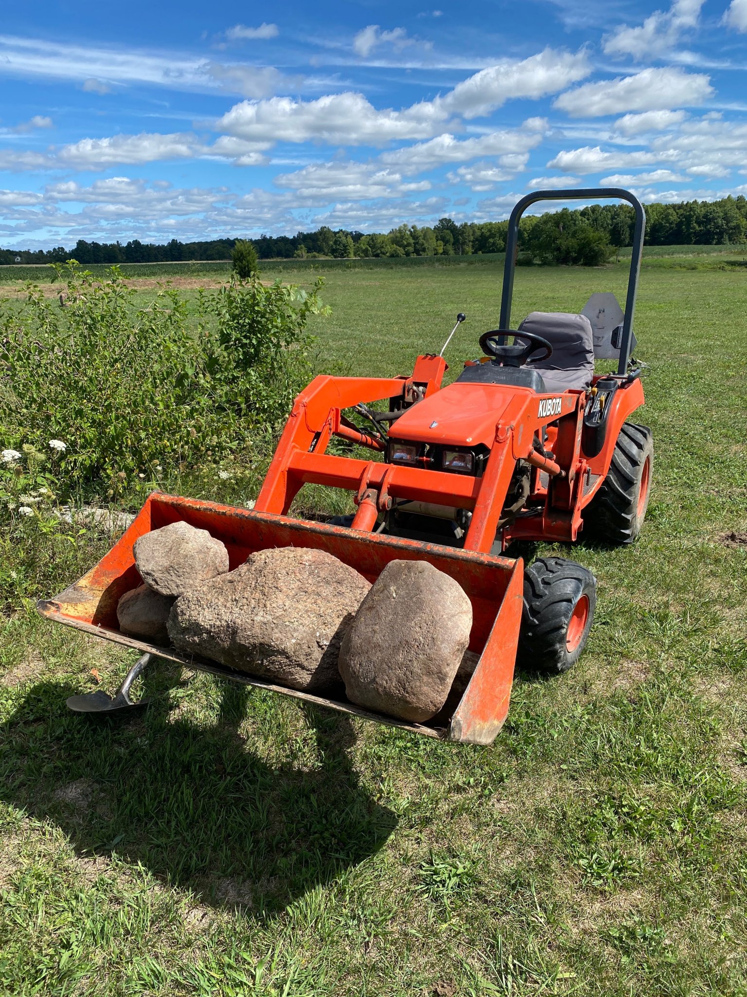 Just a quick project this morning. Last fall before I had purchased the BX I had removed an old flagpole base in the middle of the yard. It left a fairly large deep hole, so I rolled over some big rocks to cover it and prevent anyone from stepping in it. I got it done, but it was a bit of a pain and the rolling the rocks over by hand wasn’t the easiest.