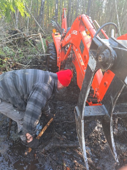 THATS not stuck, lol!! If you sink the front top of frame "UNDER" the mud and back tires to the axle all evenly, THATS stuck, lol. After 2 hours of fighting, "I" finally got out by sticking a 6 foot tree under the front bucket, curling the bucket on the tree to raise the front and using the backhoe to raise the back. Once it was raised, I had to move the bucket and backhoe at the same time to curl and scoot the tractor inch by inch out.