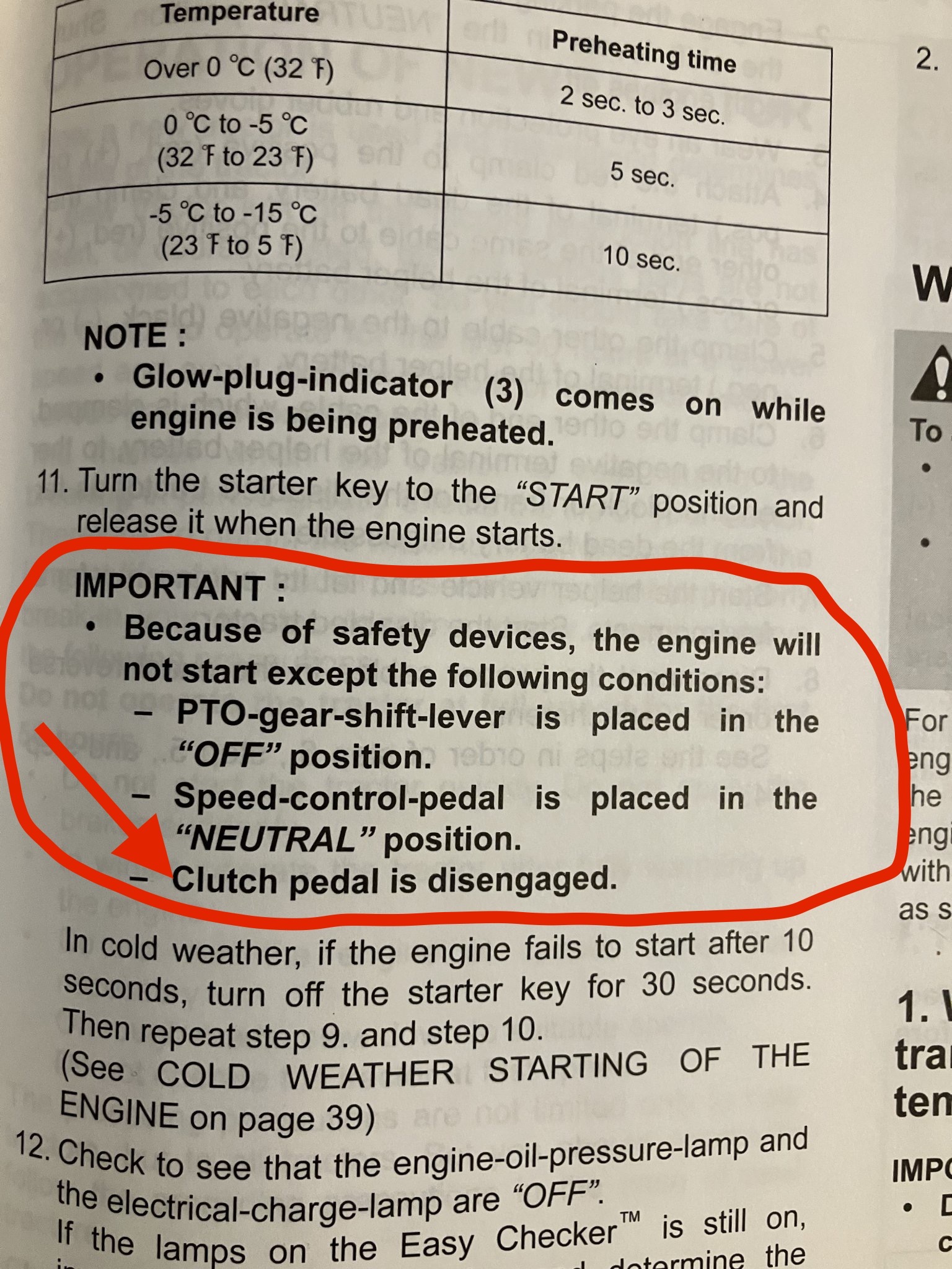 Disagree, the tractor will ONLY start with clutch pedal pressed down ie clutch is disengaged.Will not start is with the Clutch pedal pressed down.