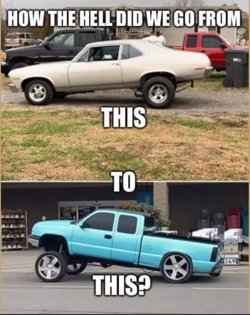 Very common around here, and I think you're right about the playground link. Kids stopped getting beat up on the playgrounds and having their precious feelings hurt, and this is the result.I grew up with jacked up muscle cars. My first 67 Chevy was like that Nova.