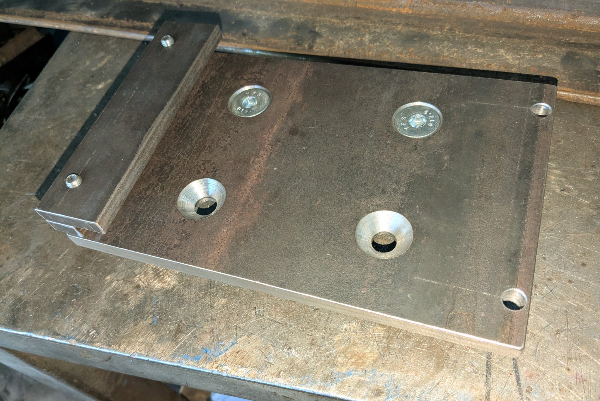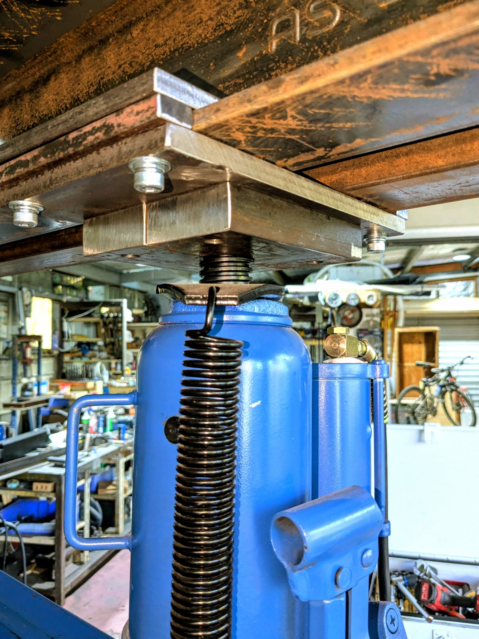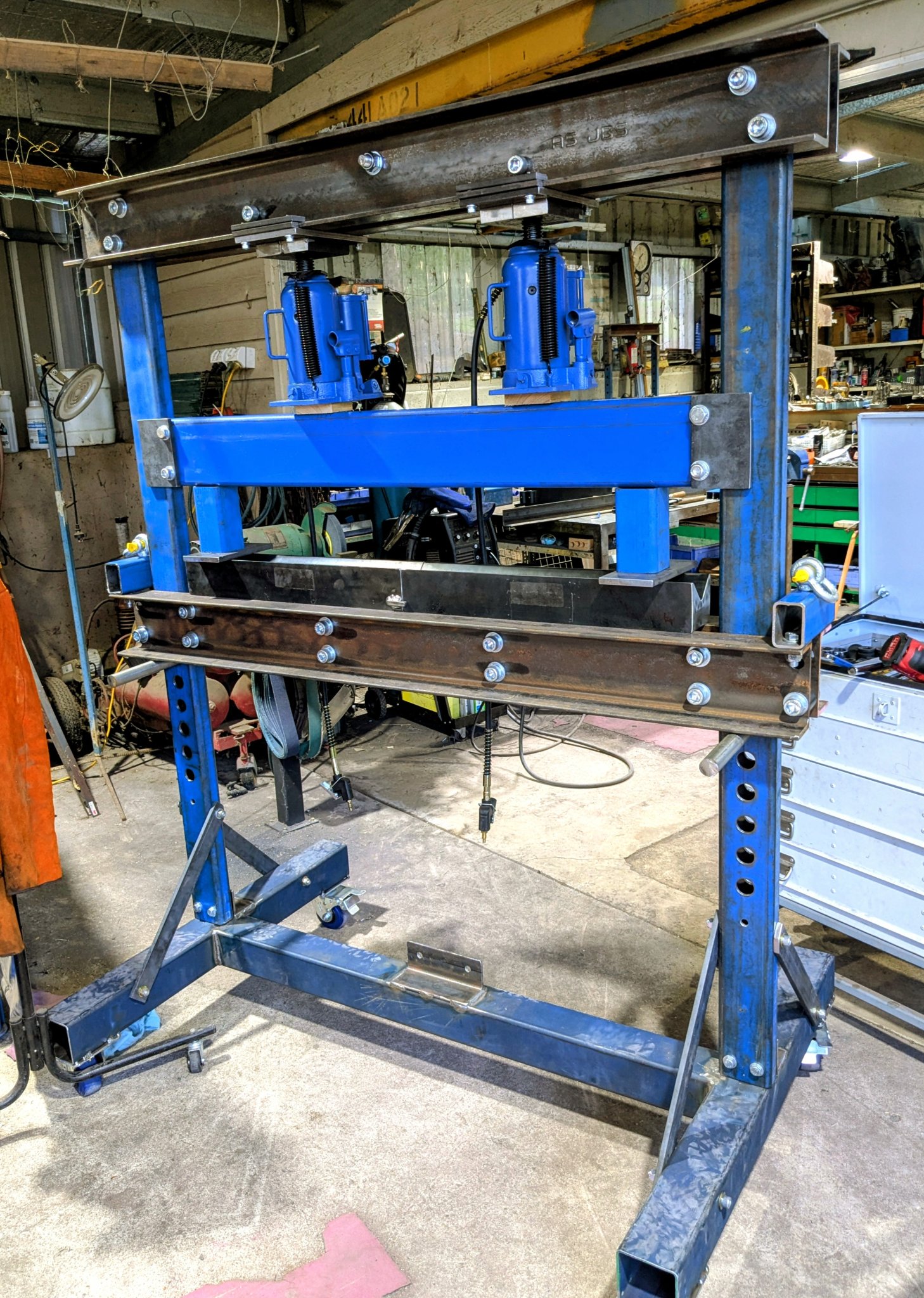 Got the 2 x 20 tonne air over hydraulic jacks hanging in place today. I've left some of the threaded stem on the jacks accessible so I can adjust to get the top and bottom tools parallel.