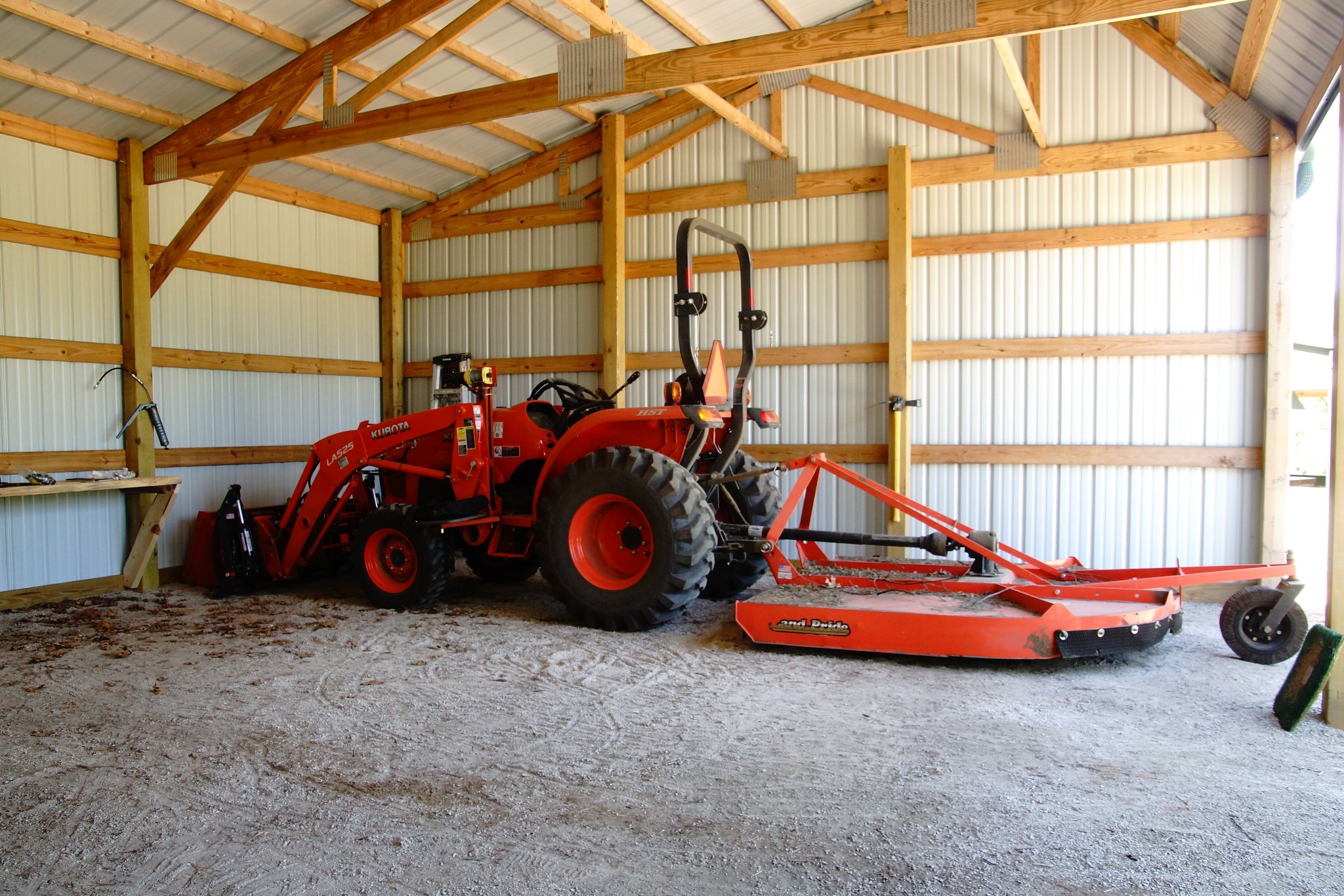 I am in the planning phases of building an equipment shed and looking for any ideas, size, etc. I'm leaning towards a 24x36 shed, mostly because i have a dirt pad about that size. Future uses would be to store equipment for our vineyard we are building. Any thoughts? I have a L3560, so nothing too crazy. Would my tractor with a bush hog on the back fit in a 24ft deep shed? It wouldn't be too hard to run electricity to it, so i may do that. Just looking for thoughts, thanks.