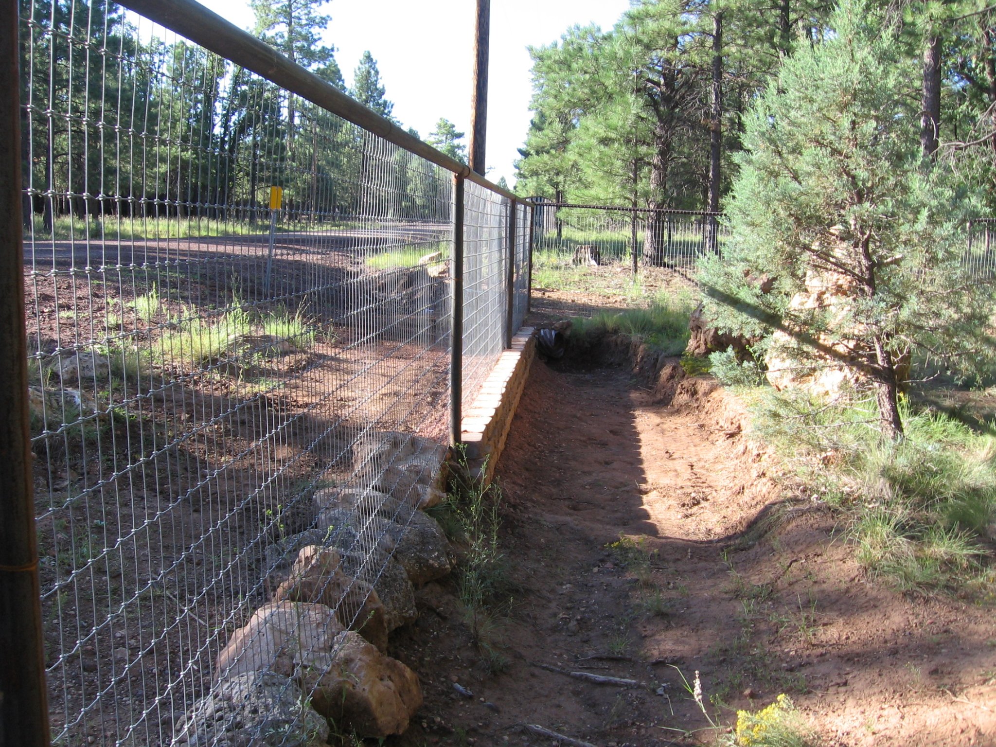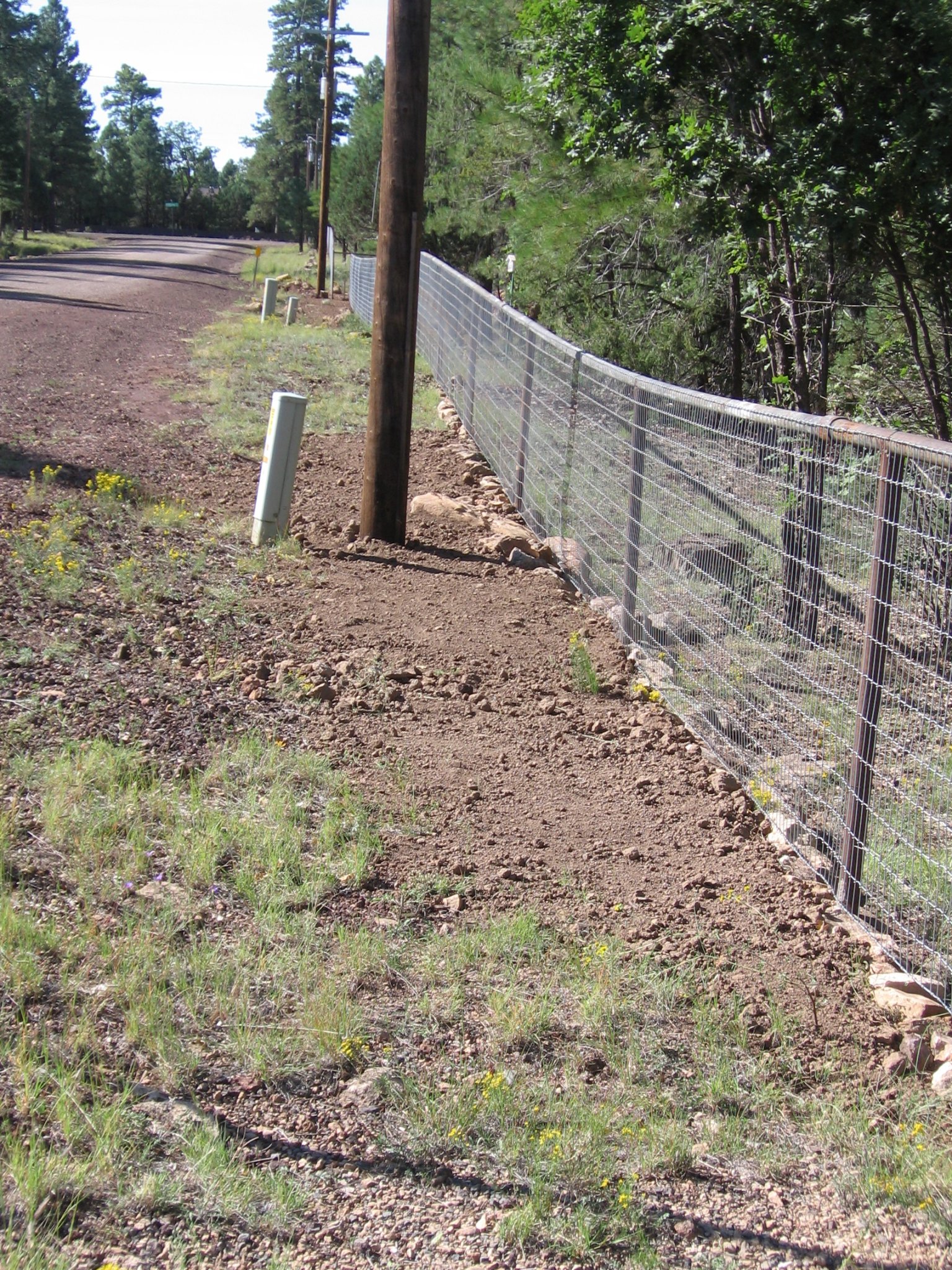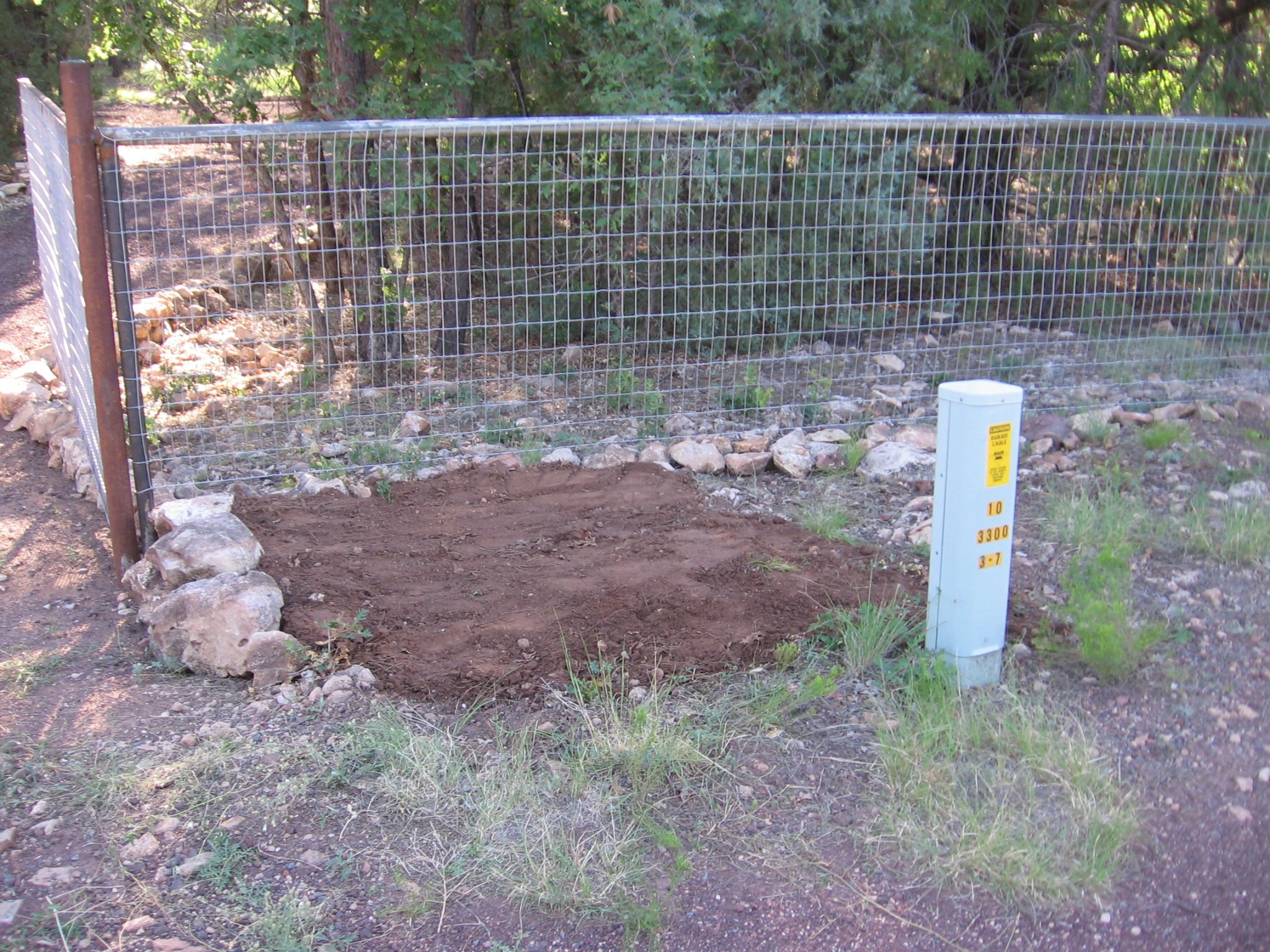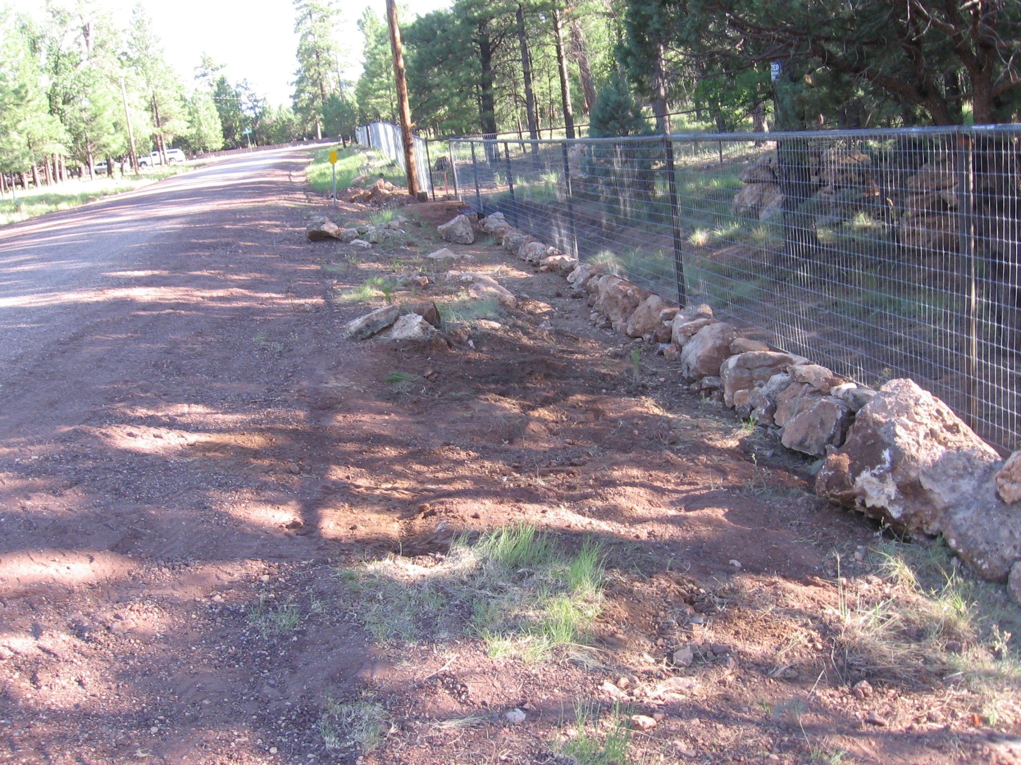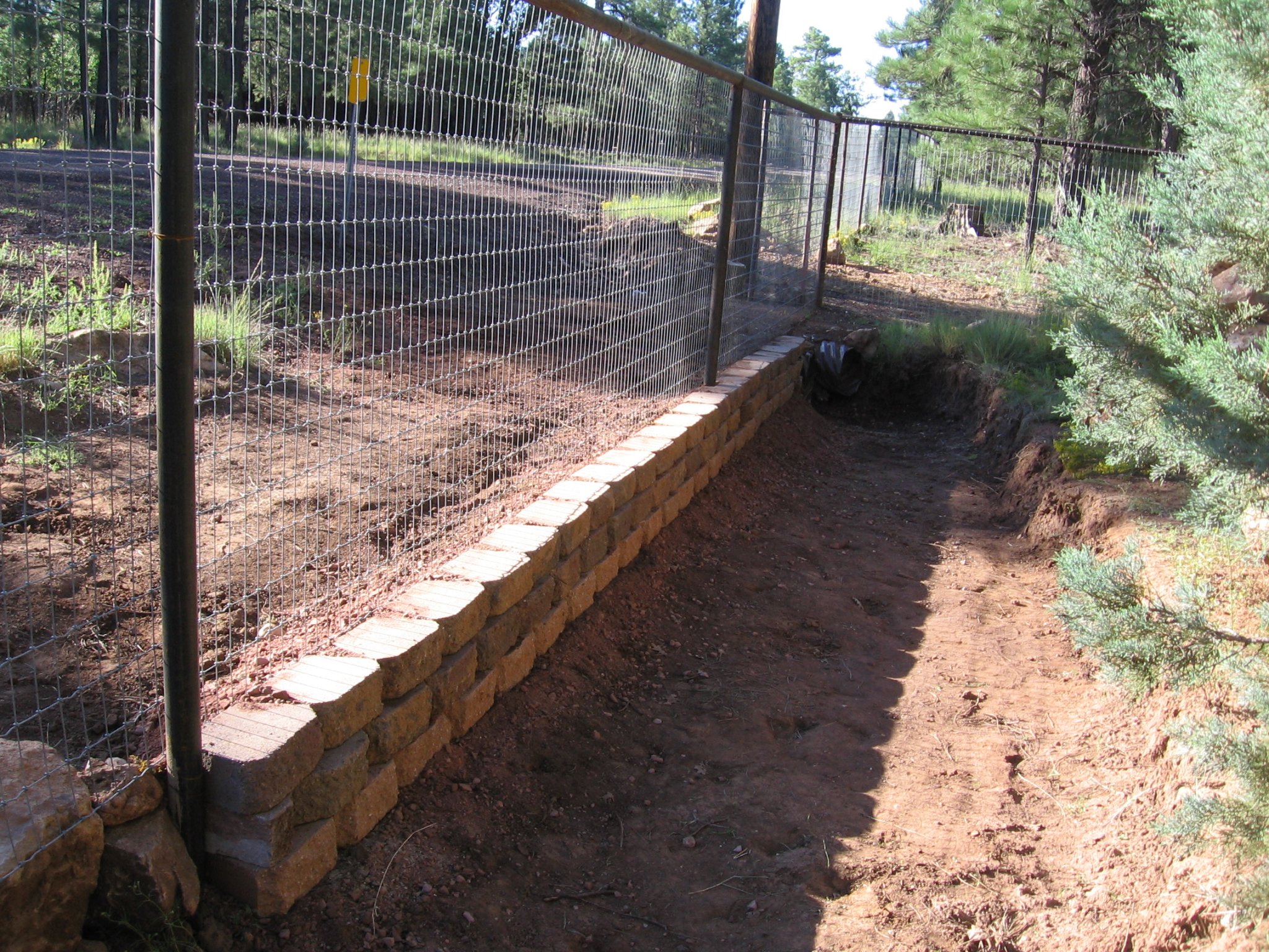 When the "retaining wall" is complete, we will fill in the low area on the outside of the fence, up to the bottom of the fence, with some free local fill, aided by the fence contractor and his LARGE backhoe & a couple dump trailers.
