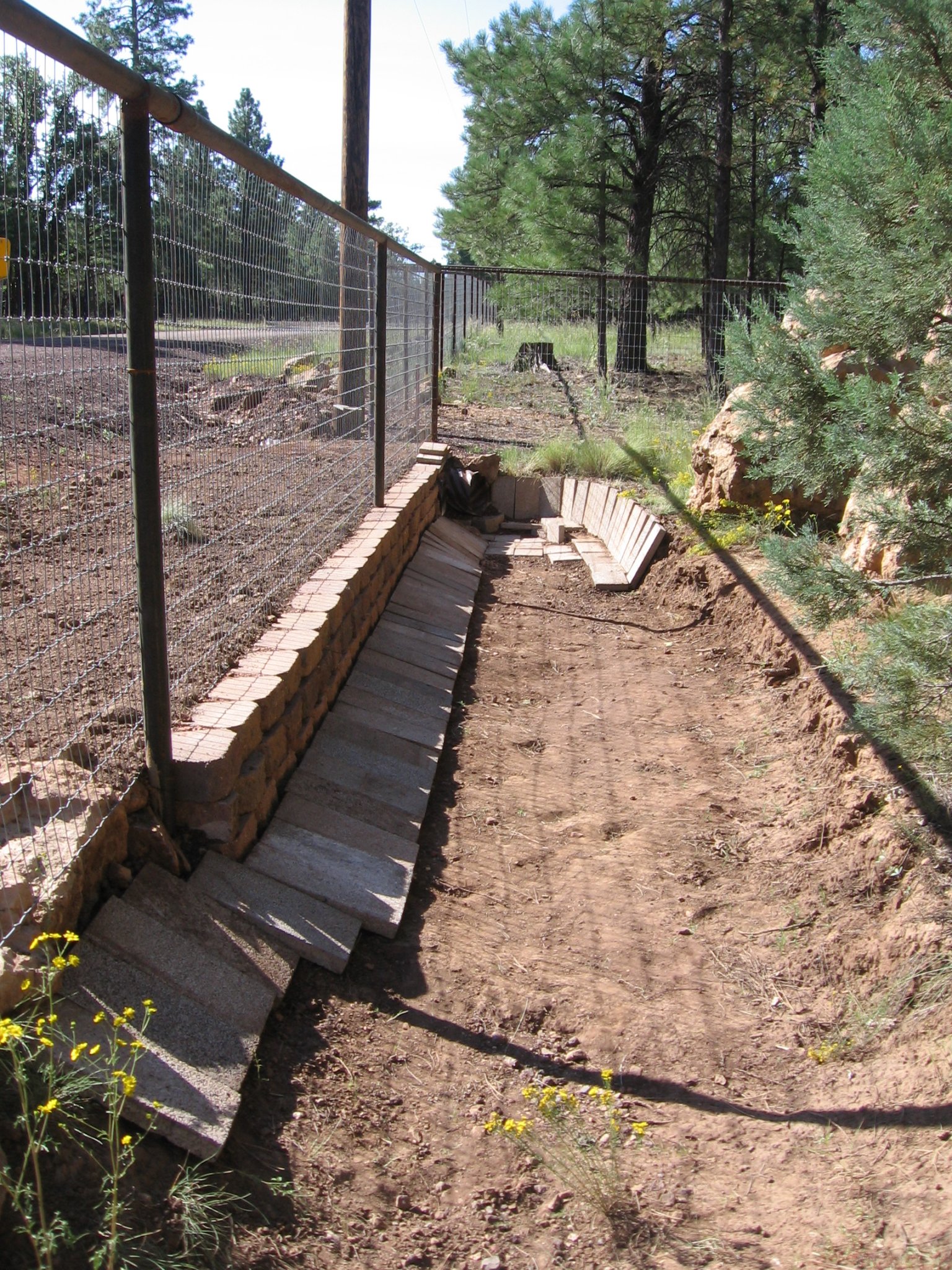 Next, I will be building a short retaining block wall inside the fence, between where the rocks end and the culverts, to prevent the dirt bank from collapsing/eroding.