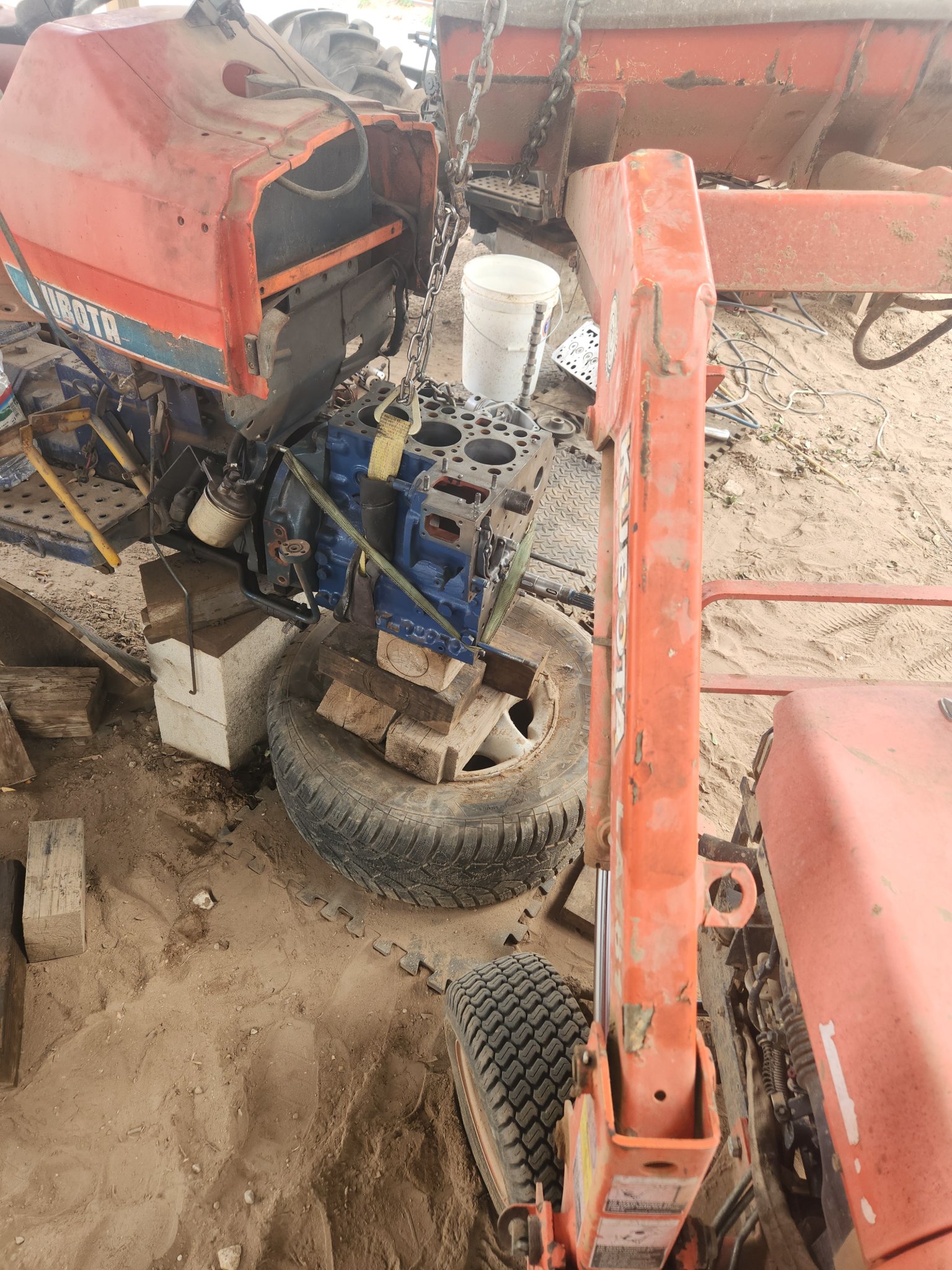 Built a pad near tractor, tried to lift it onto pad, cant, forgot how heavy it is