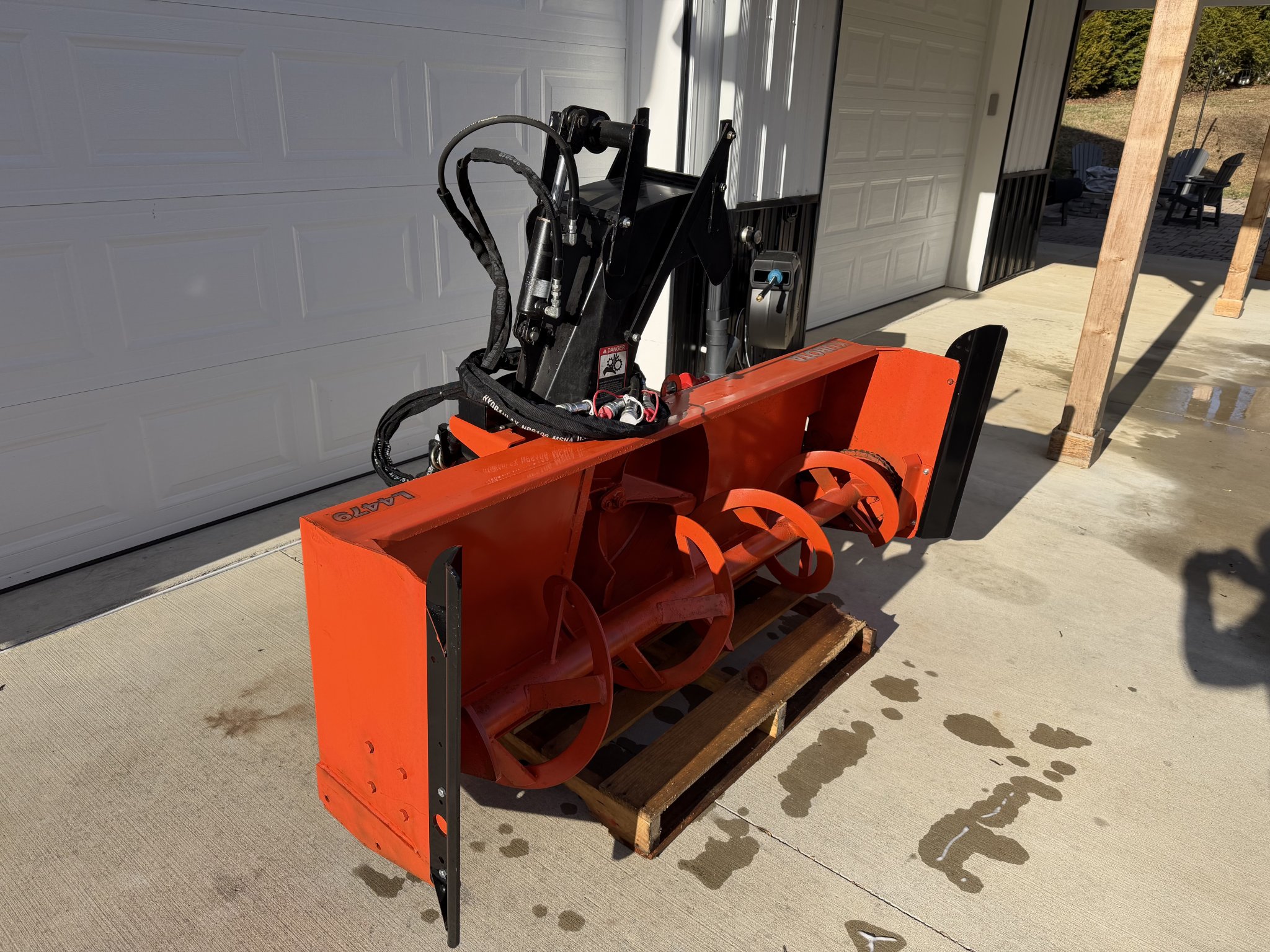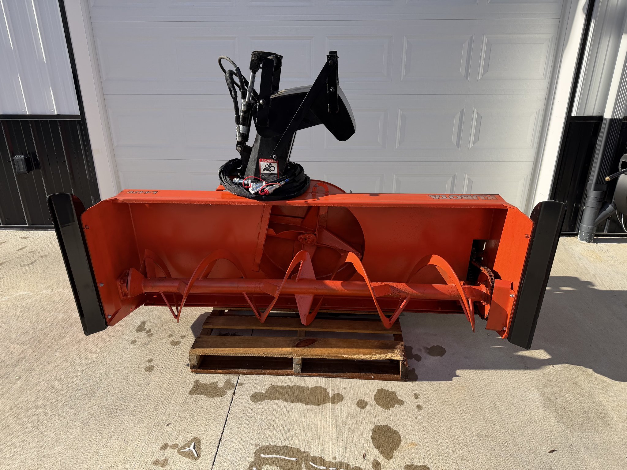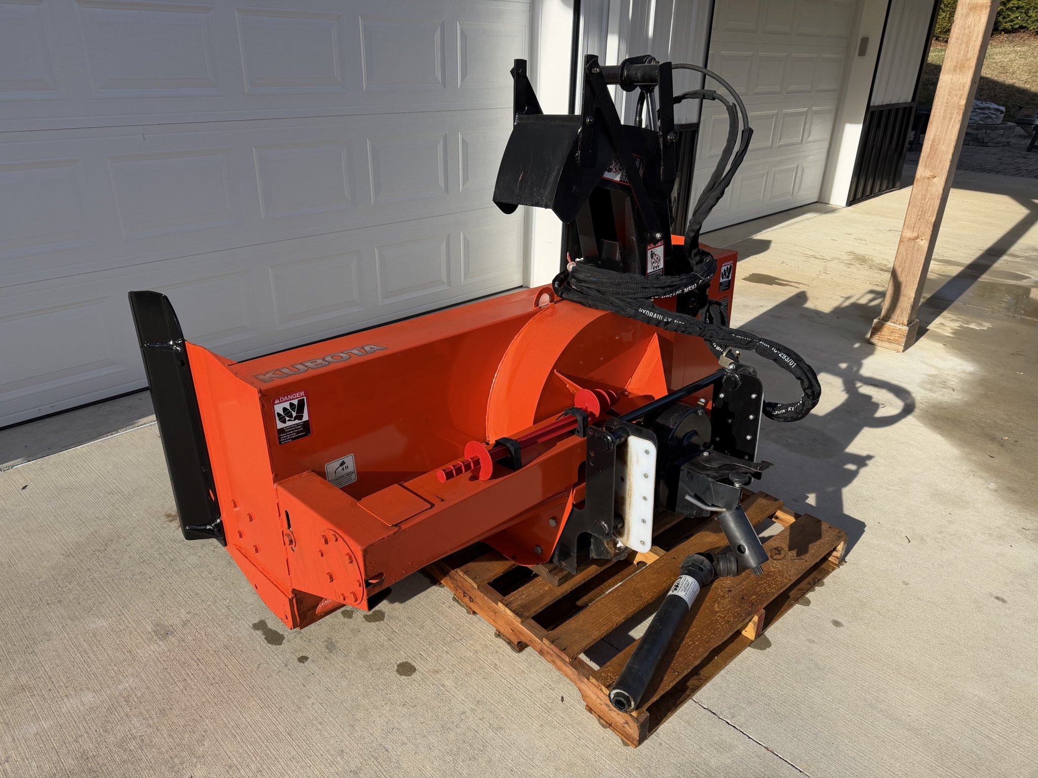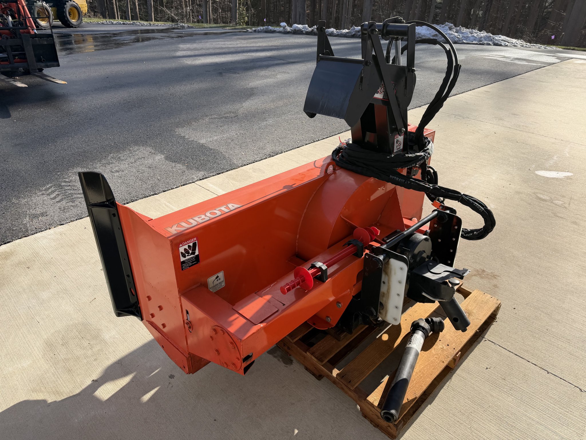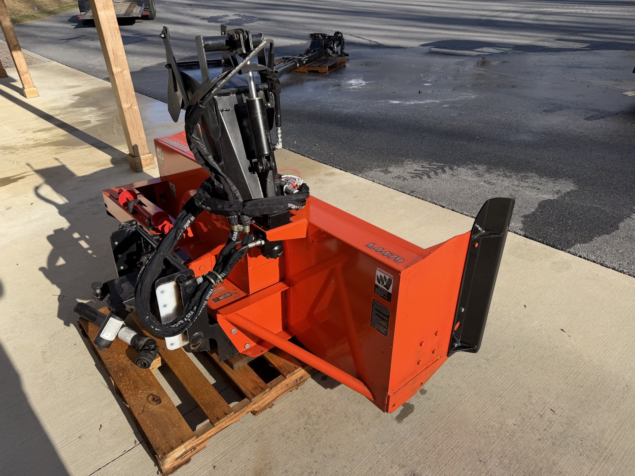 Kubota L4479 front mount snowblower with L4455A subframe / front hitch assembly. All brackets are included to install on a Kubota L40 or L60 series tractor. This unit will fit L3560 , L4060 , L4760, L5060 , L5460, L6060, L3240, L3540, L3940, L4240, L4740, L5040, L5240, and L5740. The unit will require the above tractor to have a mid PTO. If one is not currently installed it can be added to your tractor.