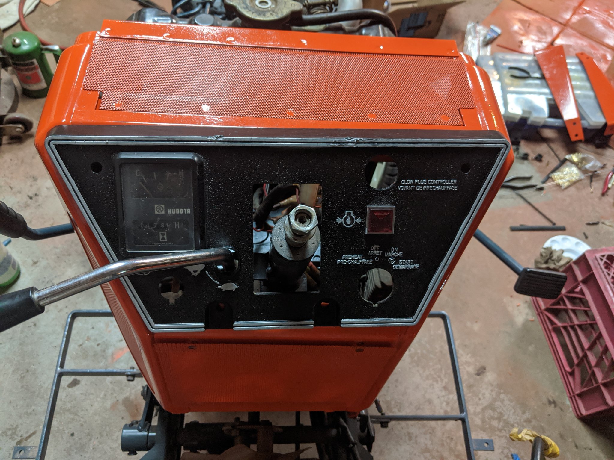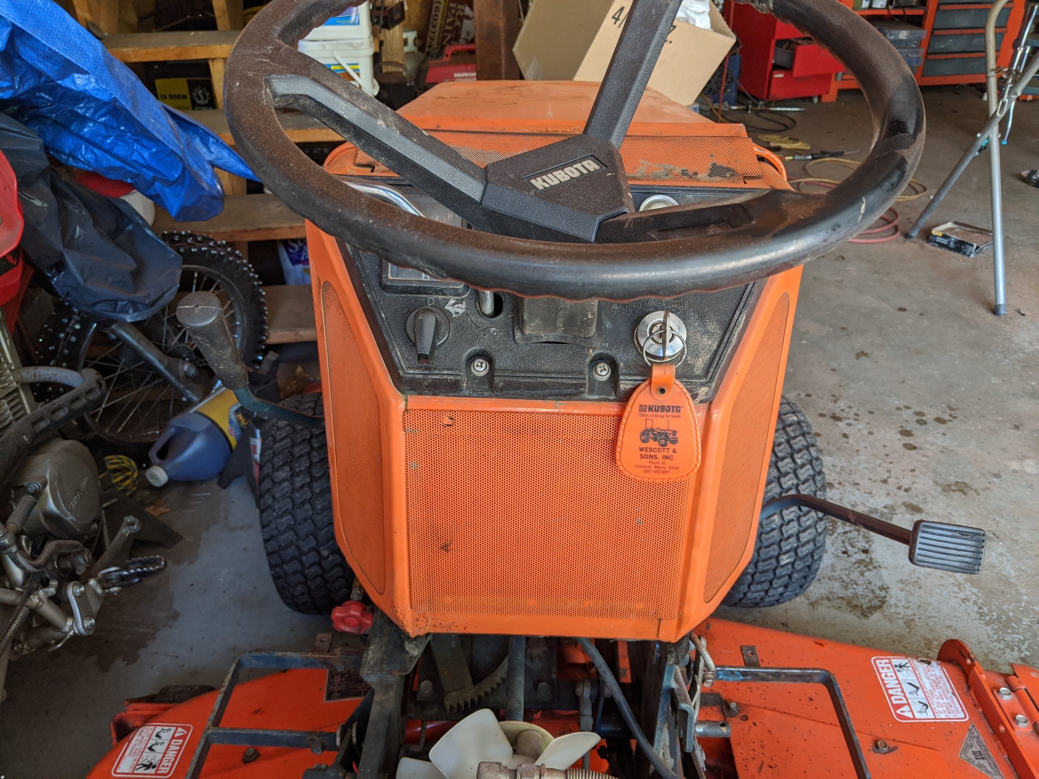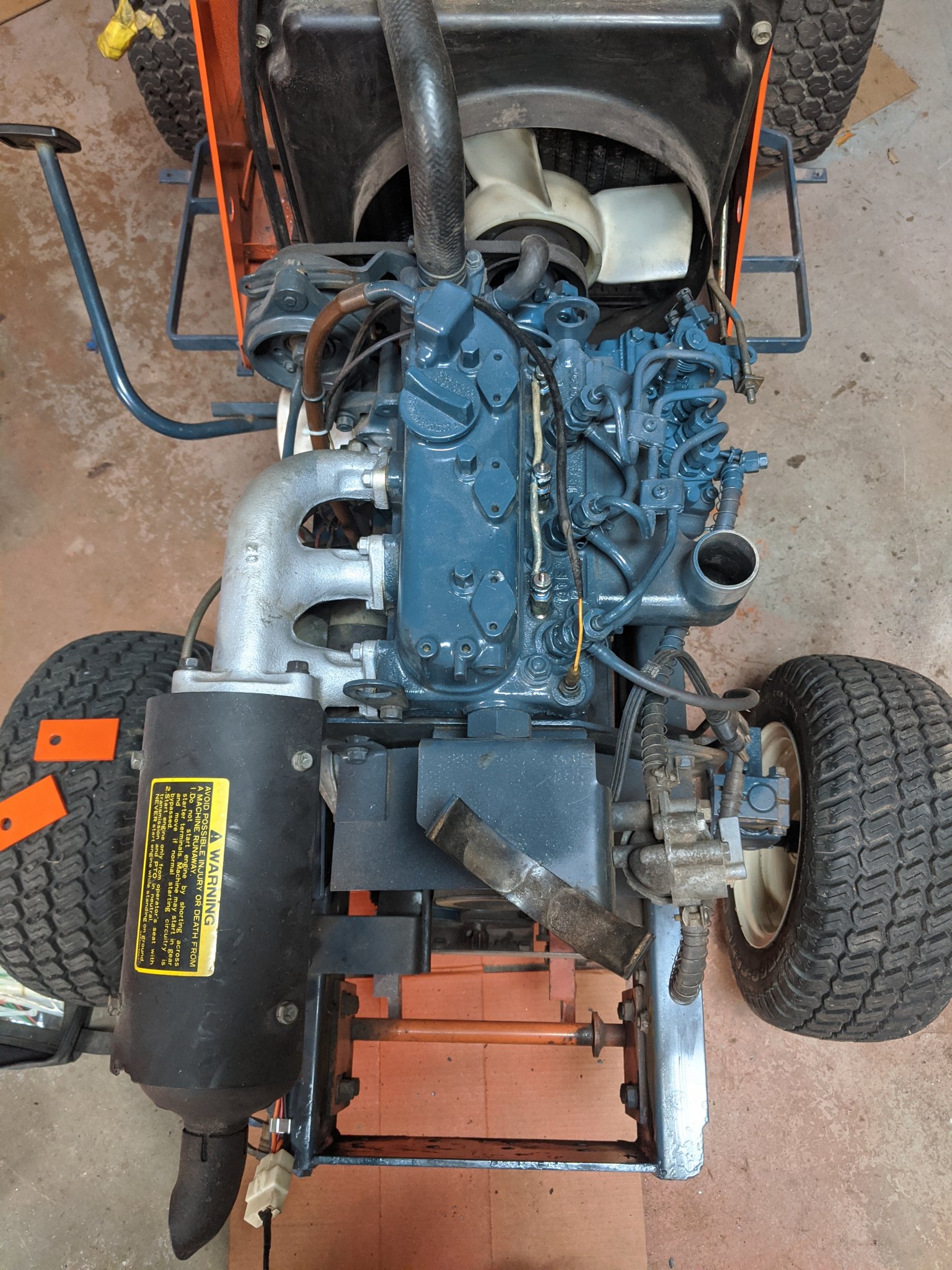 It ran really rough at idle and would not engage the mower under power, it would just bog down and die. So I went through the motor, rebuilt the injectors, replaced the injector washers, cleaned the fuel tank, replaced both fuel filters, replaced air filter, oil and hydraulic fluid and filters. I tested and replaced the glow plugs, 2 out of the three were faulty. I adjusted the tension on the PTO belts, pulled all the sensors out, cleaned tichtened and install diod grease in all the electrical connectors. Stripped down the entire tractor , Sanded and painted the wheels. cleaned and painted the Motor, exhaust intake and muffler, frame and all the body parts. I replaced the seat cover, still waiting for the rivets so it looks a little baggy in the finished photos. I pulled the front wheels repacked the bearings. Adjusted everything. pulled the brake pedal off it was seized on there and would barely move, I had to actually use a puller to get it off.