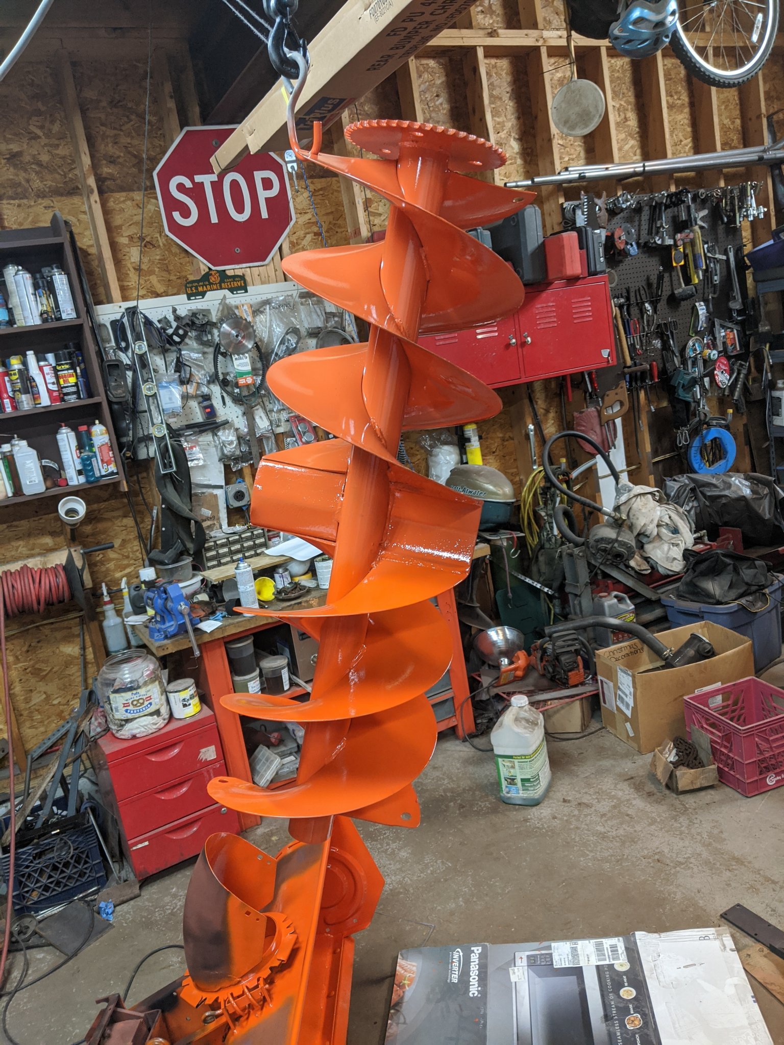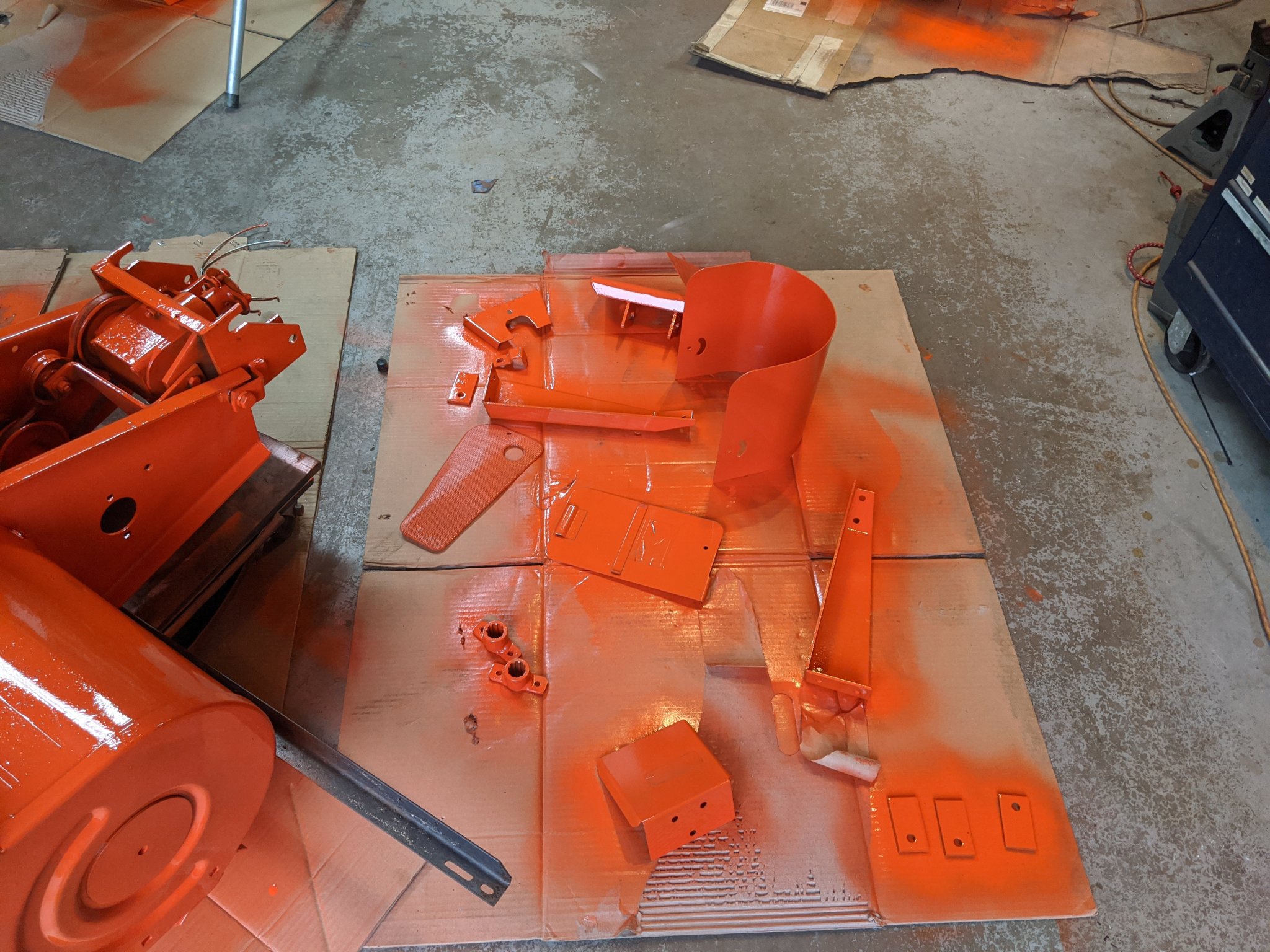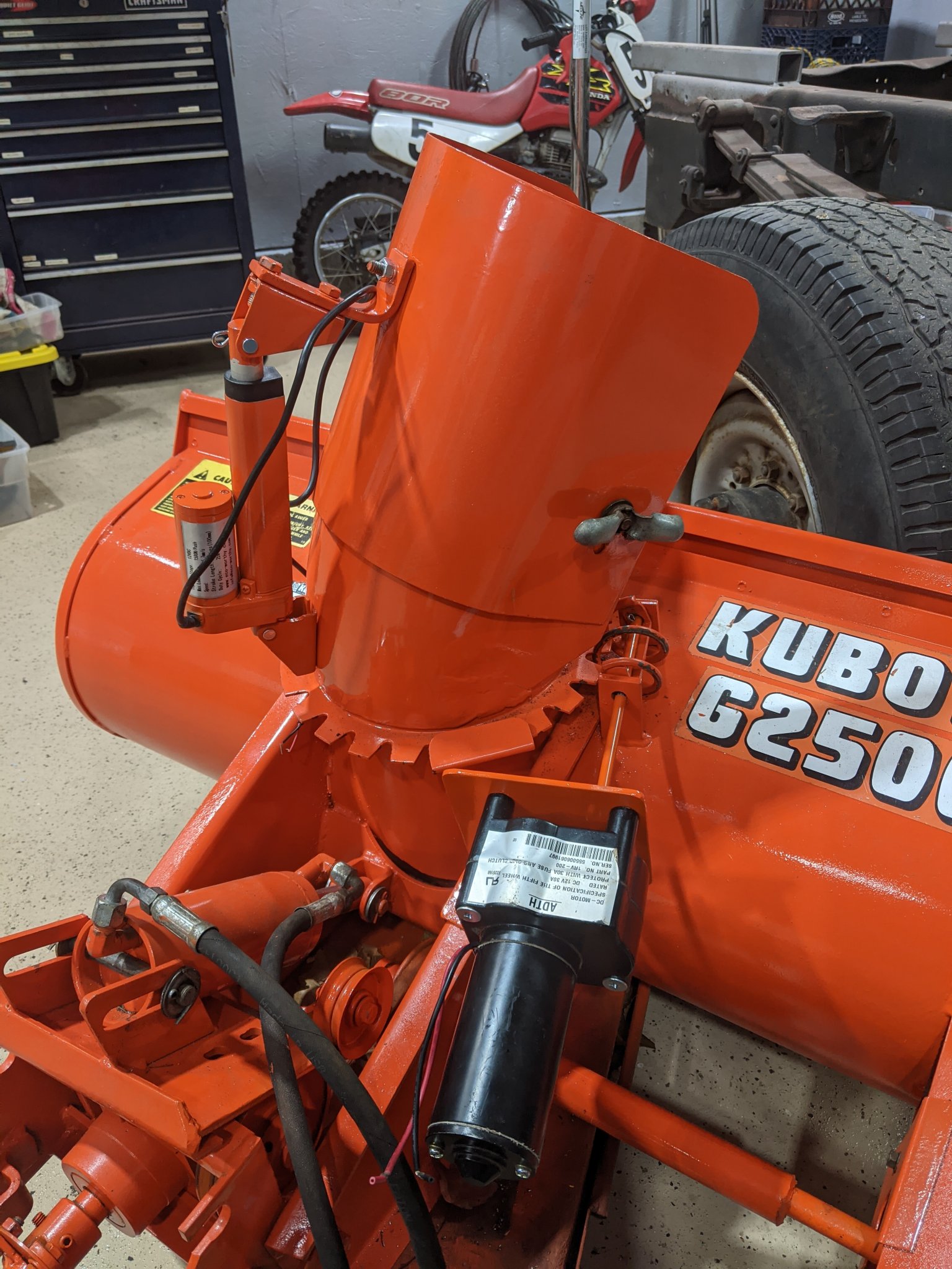 Next I stripped down the blower, pulled the auger, checked the bearings, sanded and painted the whole unit. Installed a new chain, belt and I also fabricated a mounting bracket and installed an electric motor I had laying around to rotate the shoot. I purchased a cheap actuator so the chute can now angle via power instead of getting off the tractor and shutting everything down. I then cut the old skid shoes up since they were worn down to nothing. cut some new steel and welded new plates