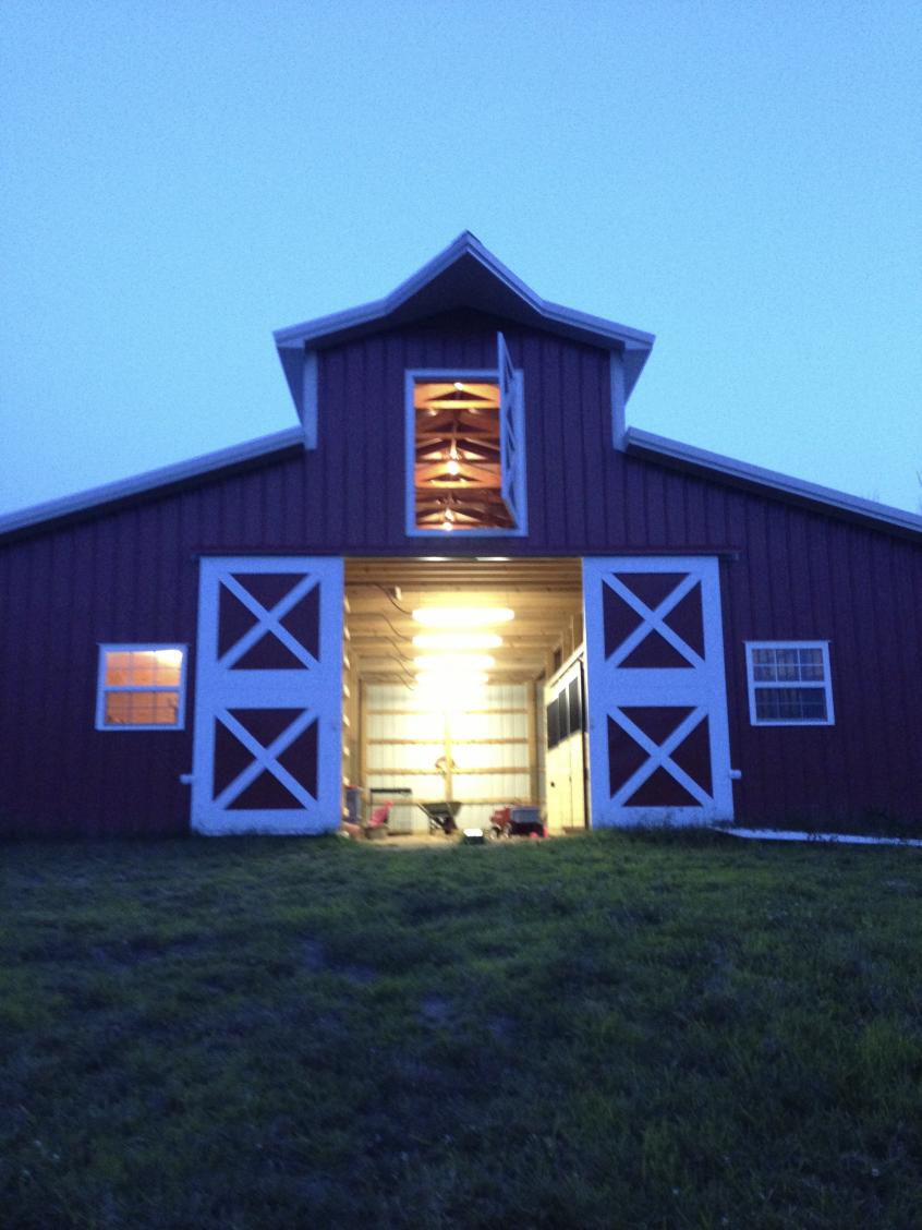 This is the horse barn we had built by an Amish crew last year when I had to move the 3 horses my FIL bought my kids from his 5 acres to my 5 acres. (I added electric lights after the Amish left.