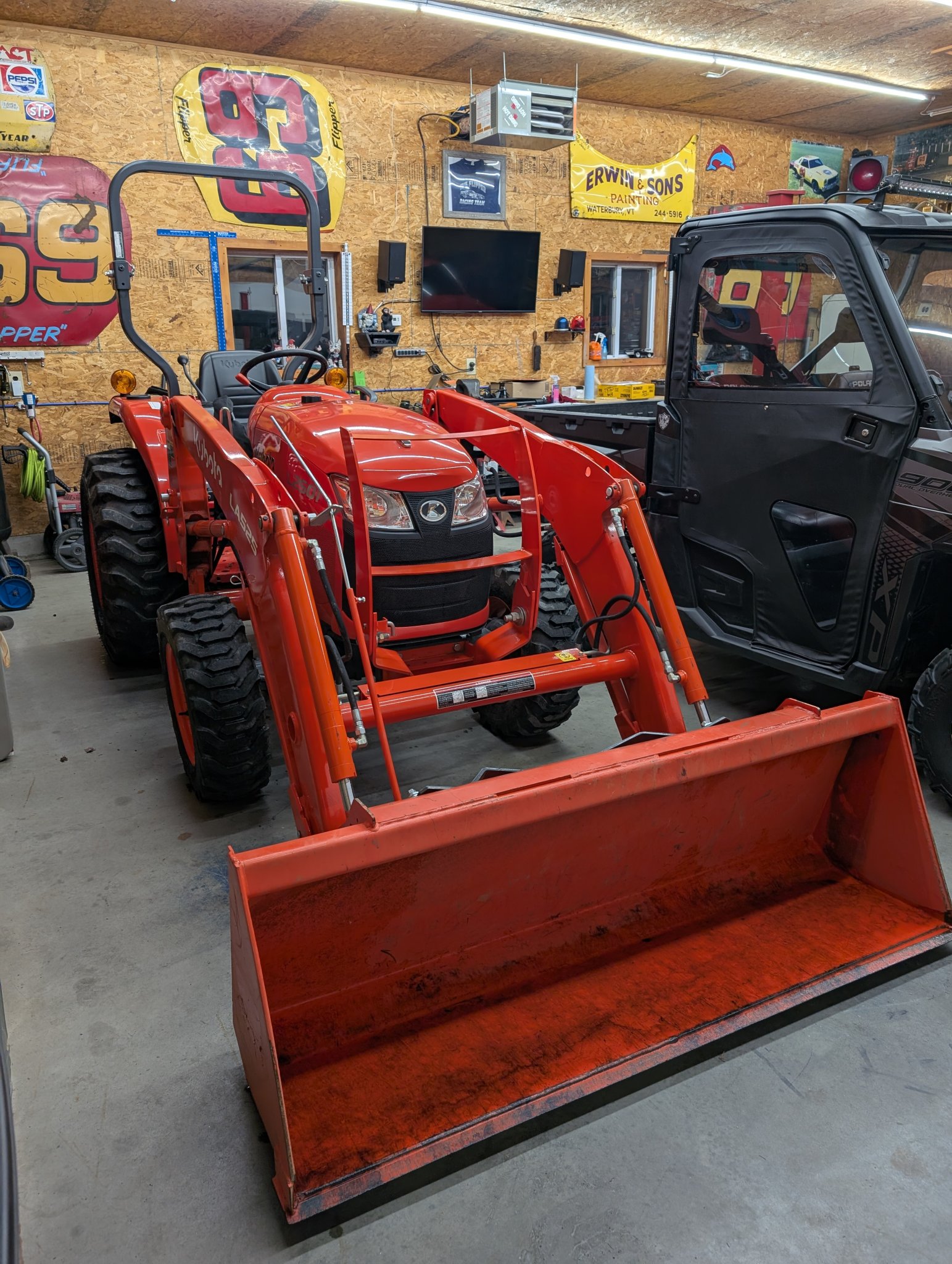 It was a long day, had lots to do. Anyways, the tractor is parked in the garage. I put the bucket on, nailed it first time using the SSQA. A lot easier than I thought. This is really my first time using it, a little nerve wracking and intimidating but I'm sure with some seat time I'll get the hang of it. I was surprised to find out the rear wheels were loaded with beet juice. I don't think I'll need that ballast box when I get the box blade. But we will see.