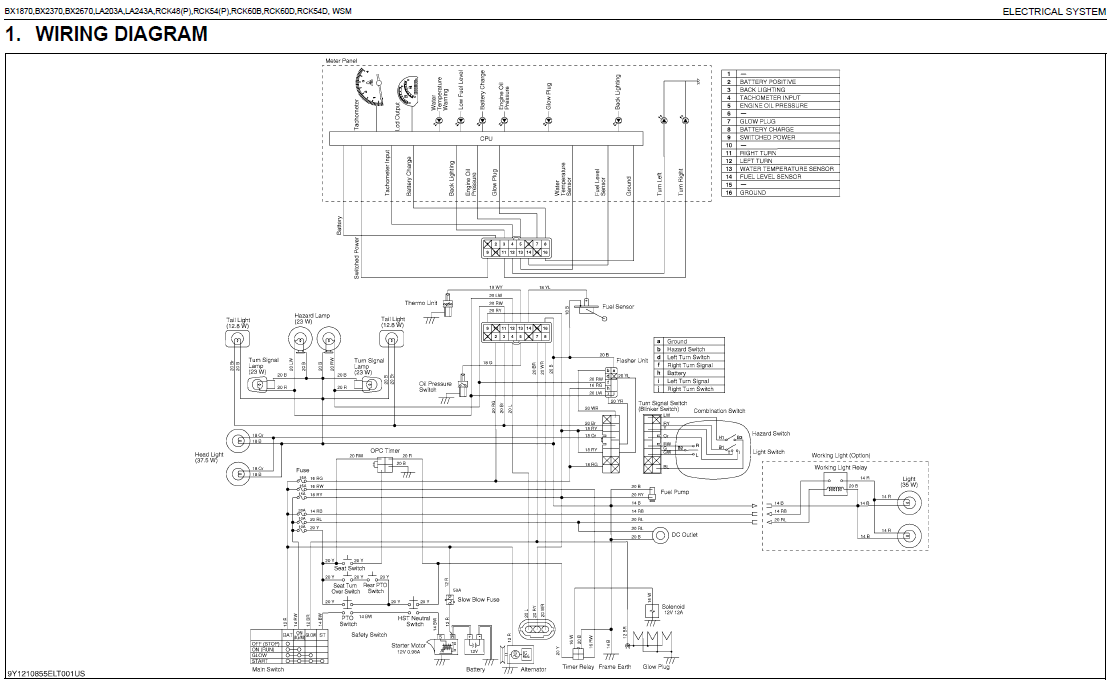 I have 2013 BX1870 bought used. moisture keeps getting under the glass of instrument Cluster. you may find that the moisture is your issue. also because Kubota did a terrible job on these the connector and pins on the back seems to get corroded. mine unfortunately broke off and my techometer doesnt work now. planning on replacing the connector with a wire harness that I will solder wires where the pins come out of the back of the instrument cluster. Pretty sad that Kubota charges so much for their machines and this is an ON GOING ISSUE.I have a BX1870. The entire cluster went out awhile back, except for the turn signal indicators. I've opened it up and found a fair amount of surface corrosion, but nothing crazy. I repaired a few traces and a couple vias with no change. I know they're terrible with their water sealing and I think there may have even been a recall on them. I couldn't find a schematic anywhere, so I'll have to see if that diagram helps.