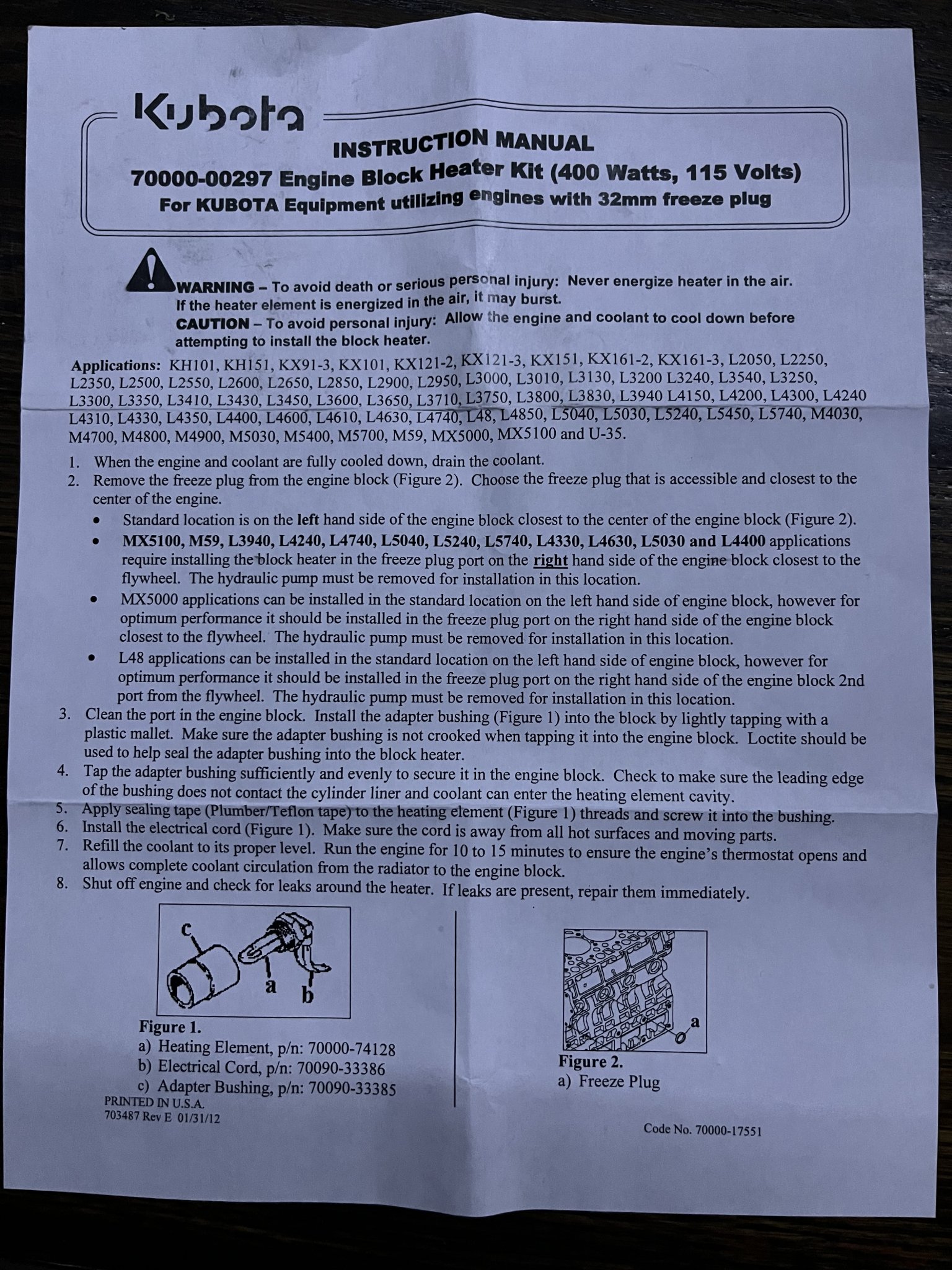 New to the forum and to actually owning a Kubota. Recently purchased a 95 ish? L2350DT and have been completing much needed fluid changes. Purchased a Kubota block heater part# 70000-73274 along with the threaded sleeve that should be everything but witch freeze plug does it go in? Thinking the forward one on the left would be easiest but is it the middle one or?