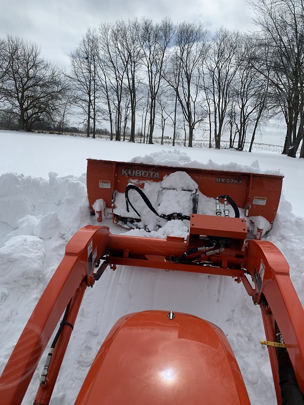 The Land Pride has +/- 5° "side float" which allows the blade to rotate about the loader to adjust for camber changes which works well. The trip feature is rarely activated, but is still good to have. This is all cleared with the hydraulic angle plow. The MX with a rear blower and front plow works well for me and I don't see any system out there that's significantly better given the mix of asphalt and gravel that I clear all winter long.