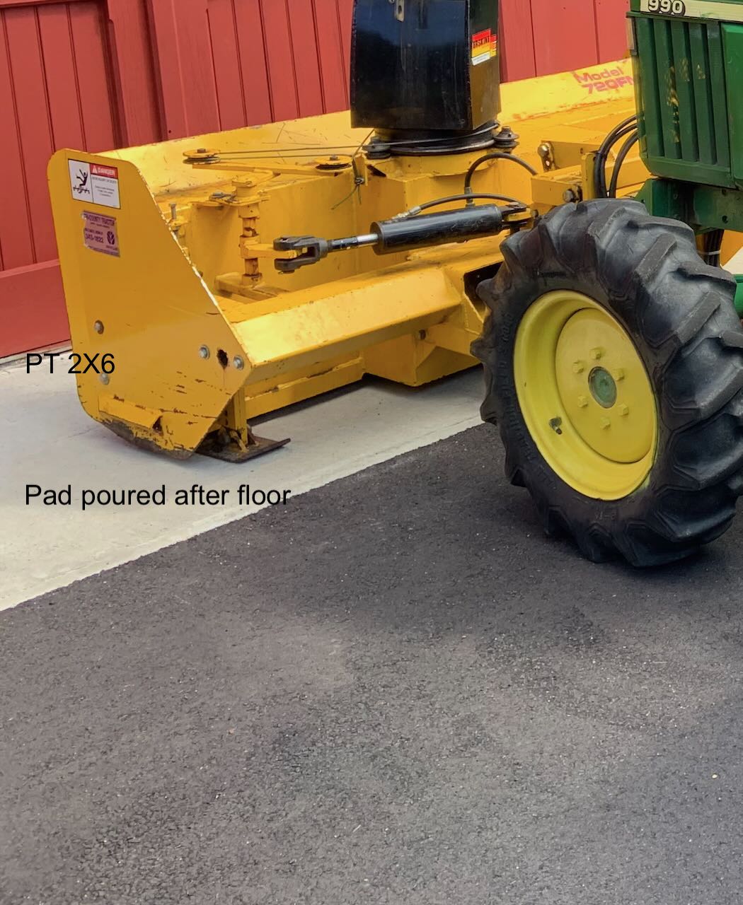 Pictures?Too late now but for others...... I use a 2X4 or better a 2X6 of the most rot resistant pressure treated wood to close off the entrance edge of the concrete. Then I form an apron in front of it at the approach to the door. I leave the outer edge of that apron open so the truck can back (or if you are lucky, drive) up to the internal pour. When the floor is filled I ask the driver how much concrete is left and adjust the outer form to accommodate the remainder. That way the overage you must order to be sure of having enough becomes an apron approaching the door. The pressure treated 2X6 stays in place dividing the apron from the floor to avoid cracking. I have been doing this for 20 years with great success. Recently I put 1"-2” of blue or pink insulation under the apron just before the concrete goes down and it does not heave due to frost here in the north land. If I am really thinking I frame another pad in front of the man door and the last bit of concrete goes there too. If we run out I mix it later in my borrowed mixer with gravel from the perimeter back-fill and Portland cement with rebar and insulation. It always feels like I get something for nothing as the concrete would be wasted otherwise.