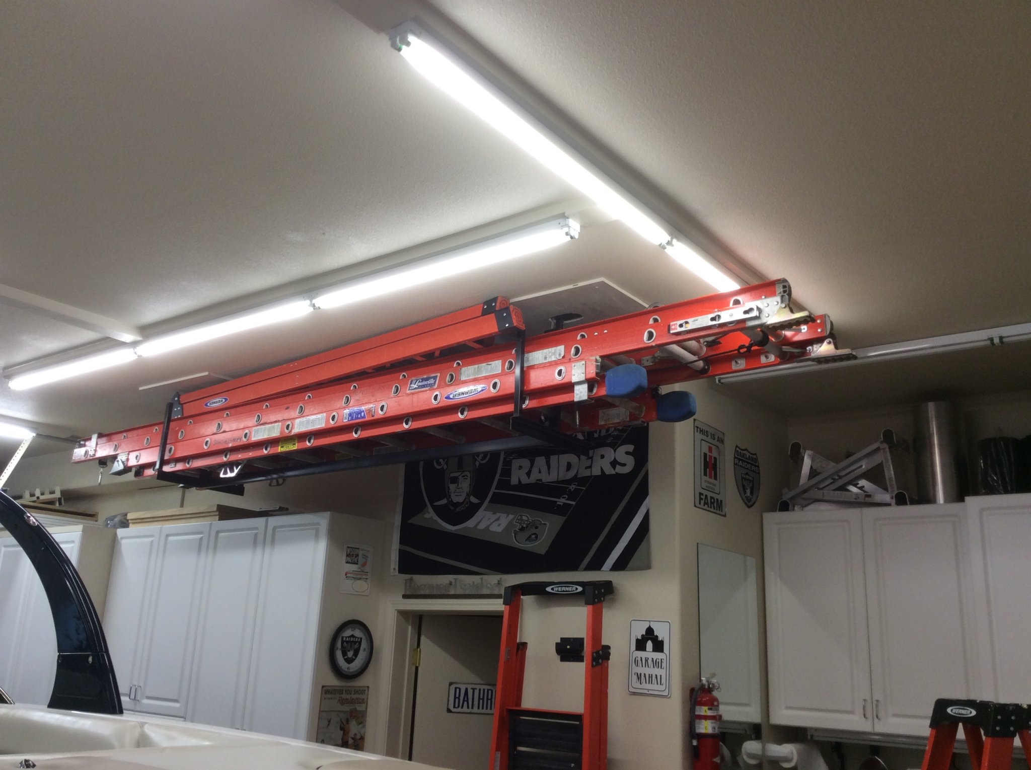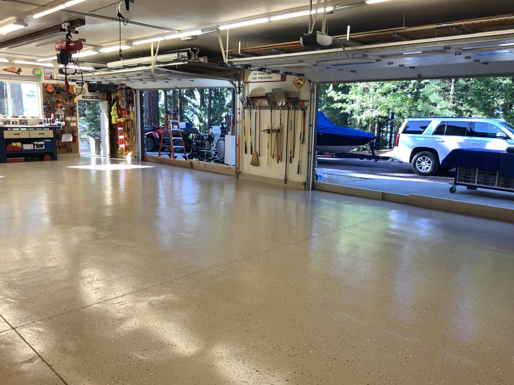 Oooh, a vacuum hose reel. That's going on the list.Big bench, big doors, lots of storage and lots of lights/power.