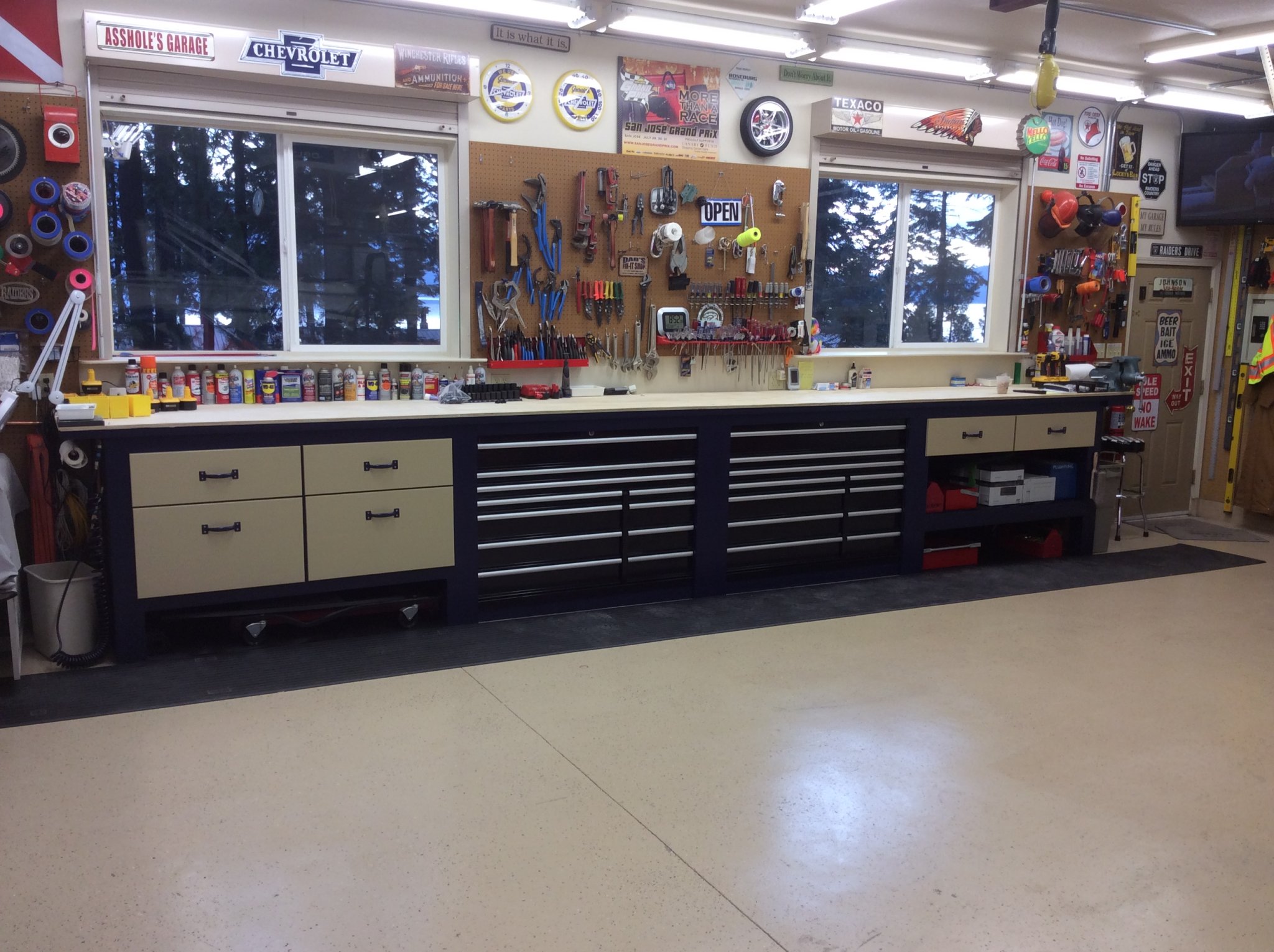 Thanks, I def need some kind of improvement on the small parts and hardware. I have a bunch of the wall mounted thingies with all the little drawers. The drawers always seem under- or over-filled.Since you like hard board, consider 1/4" pegboard from 4' to 8' above floor level all around. Also, as previously mentioned, install outlets ~4' above the floor.