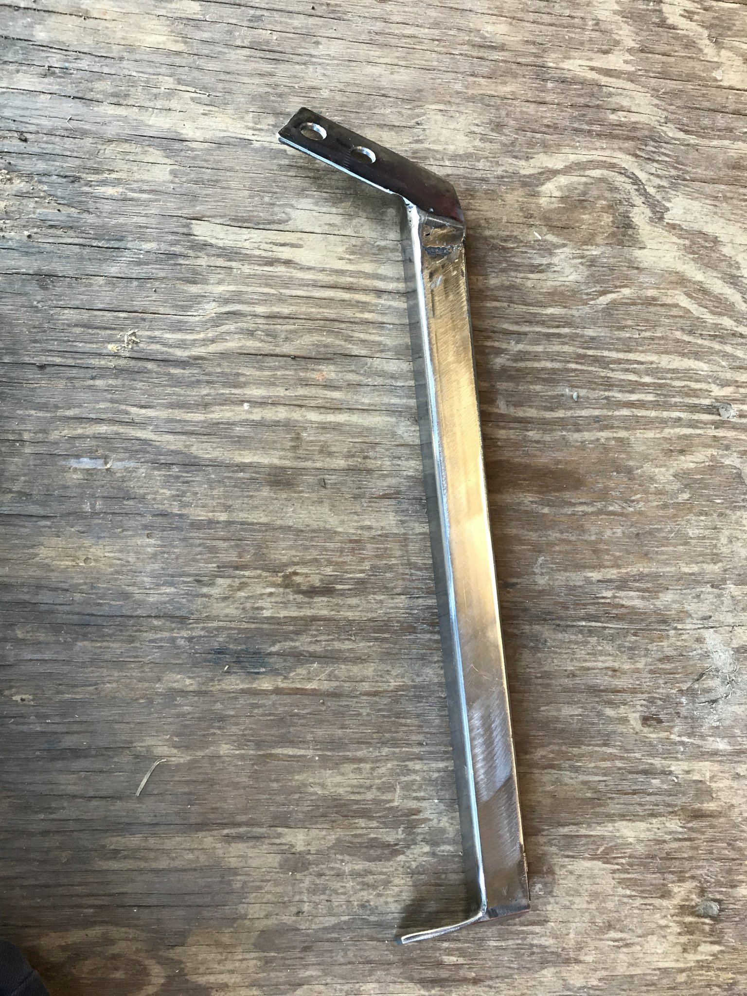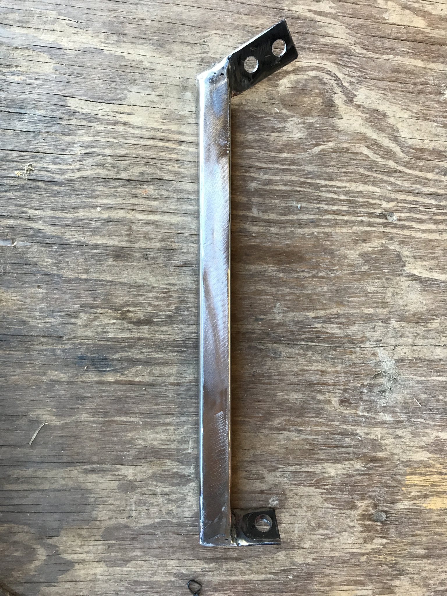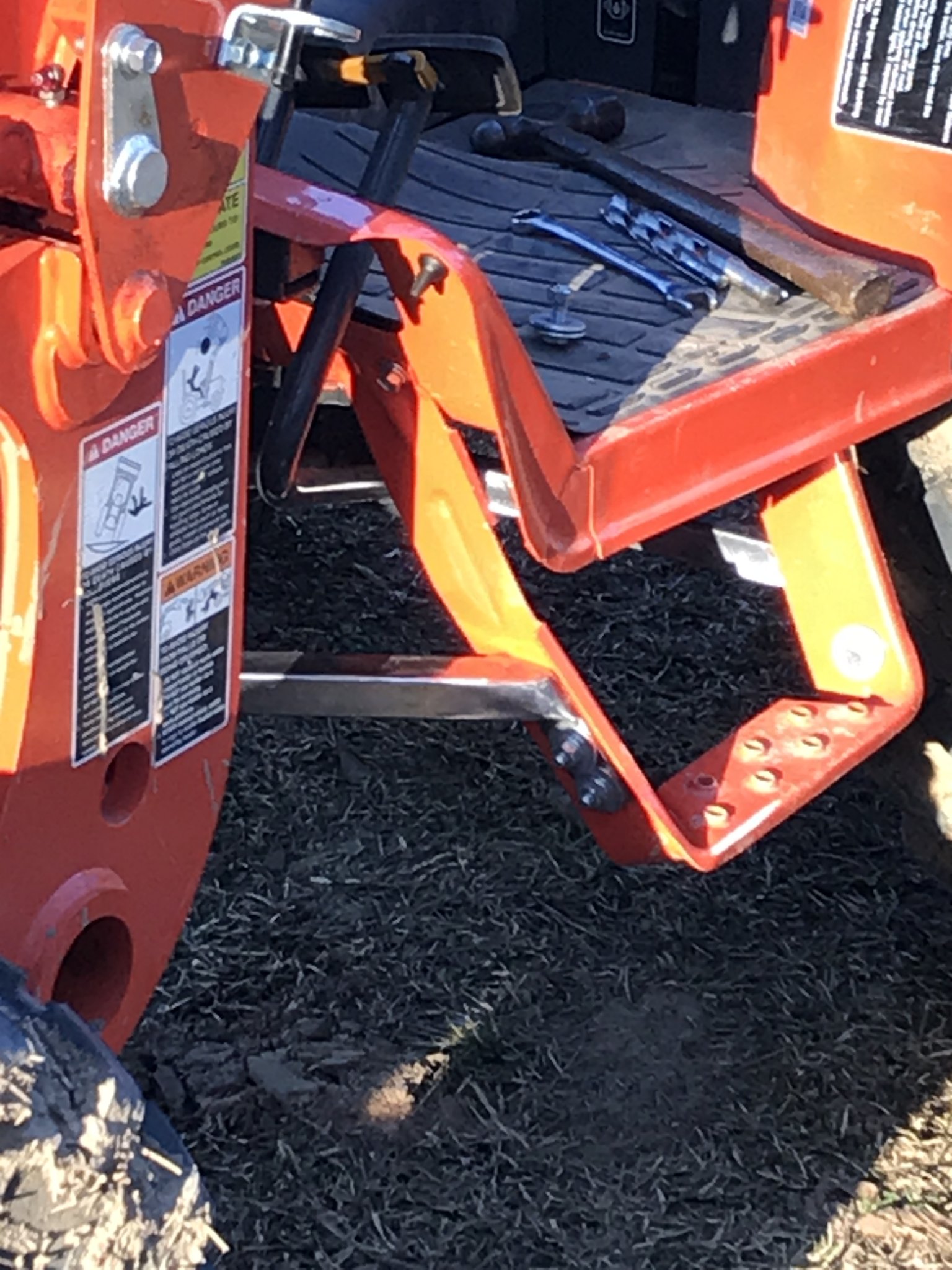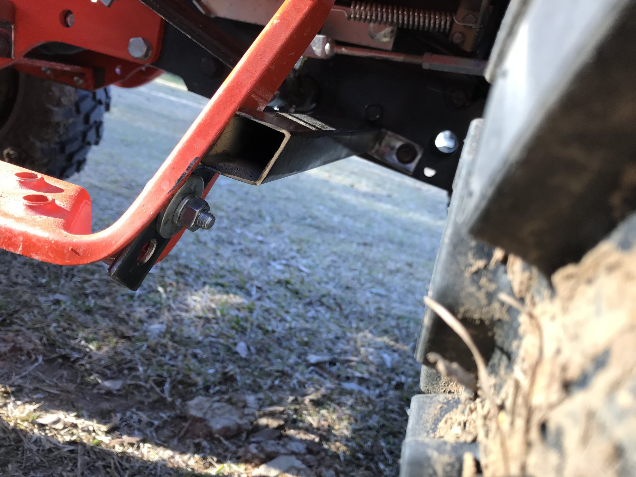 Didn't take any close-ups of the rear brace, but it was very similar to the front brace. Made the braces with 1" square box beam and 1.25" flat bar stock (which really wasn't very flat). Never realized just how hard rolling scale is until I tried to polish up the braces after welding. Welded the bolting flanges to the box beam, and drilled one hole for the tractor end, and two holes for the step end. Wound up using only one hole on the back.