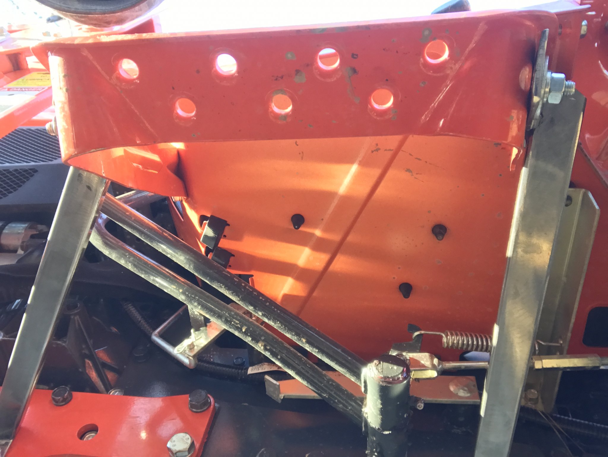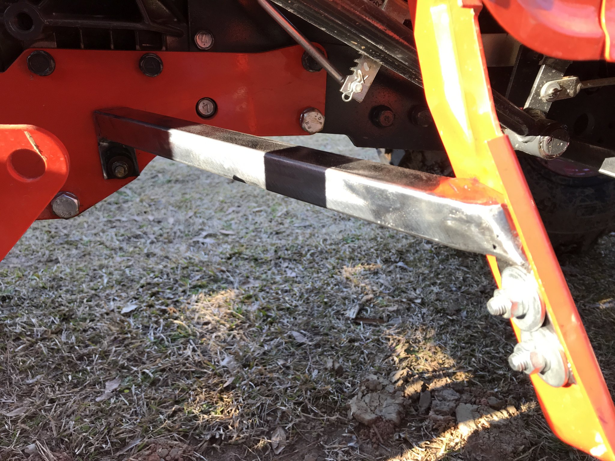 I have learned that I'm an excellent welder, if you leave me alone with a grinder long enough. I didn't learn wire-welding in high school, and high school was a LONG time ago. Marking and cutting the angles on these was fun. Kinda free-handed them, and then what didn't match up, I filled in with the wire. Had to be careful not to blow holes in it, but managed to seal up the front bracket. Still gotta put a cap on the end of the rear brace. and close it up, then I'll drill some holes to keep 'em from filling up with moisture. A little Kubota orange, and these puppies will look like they belong here.