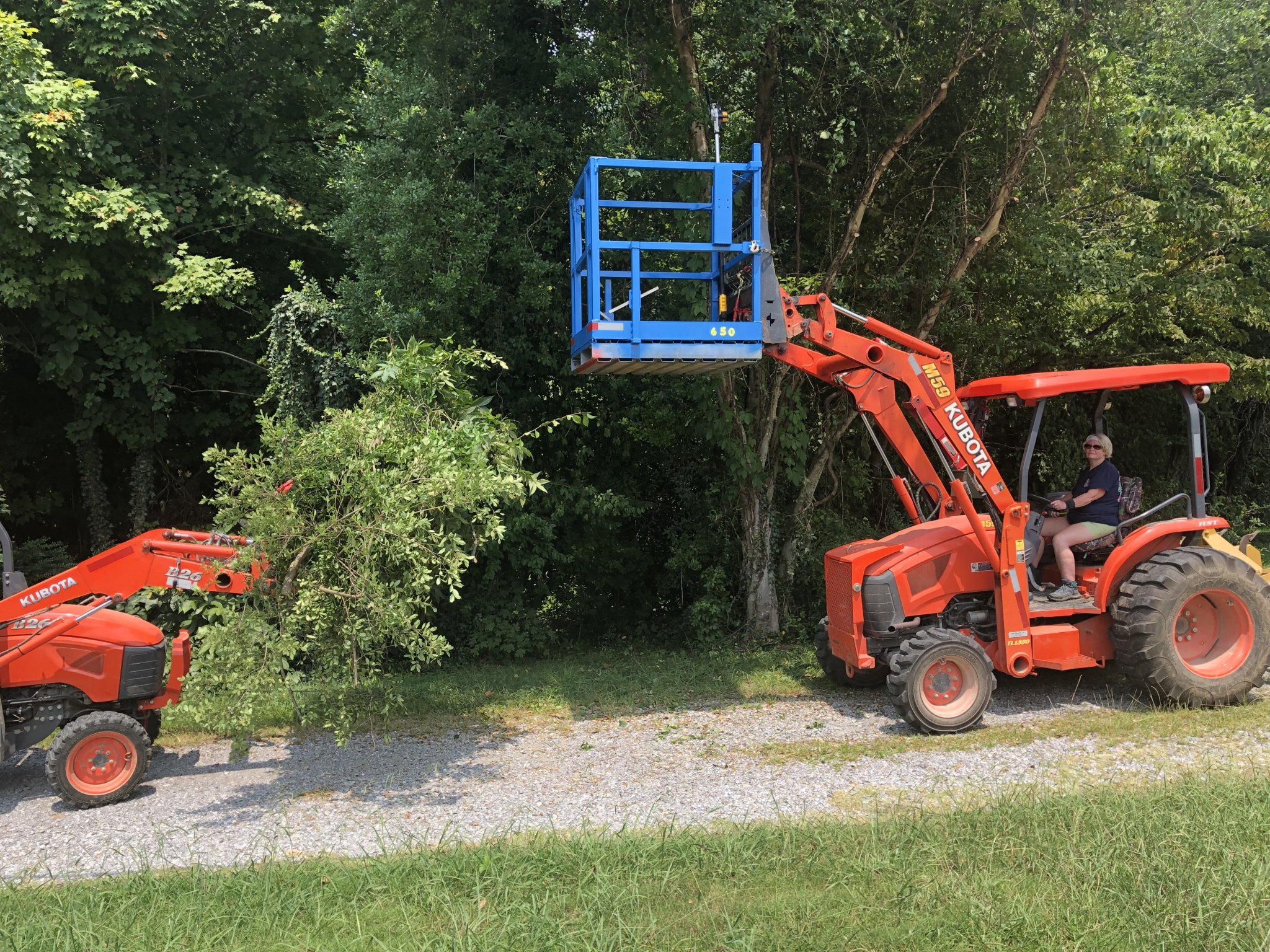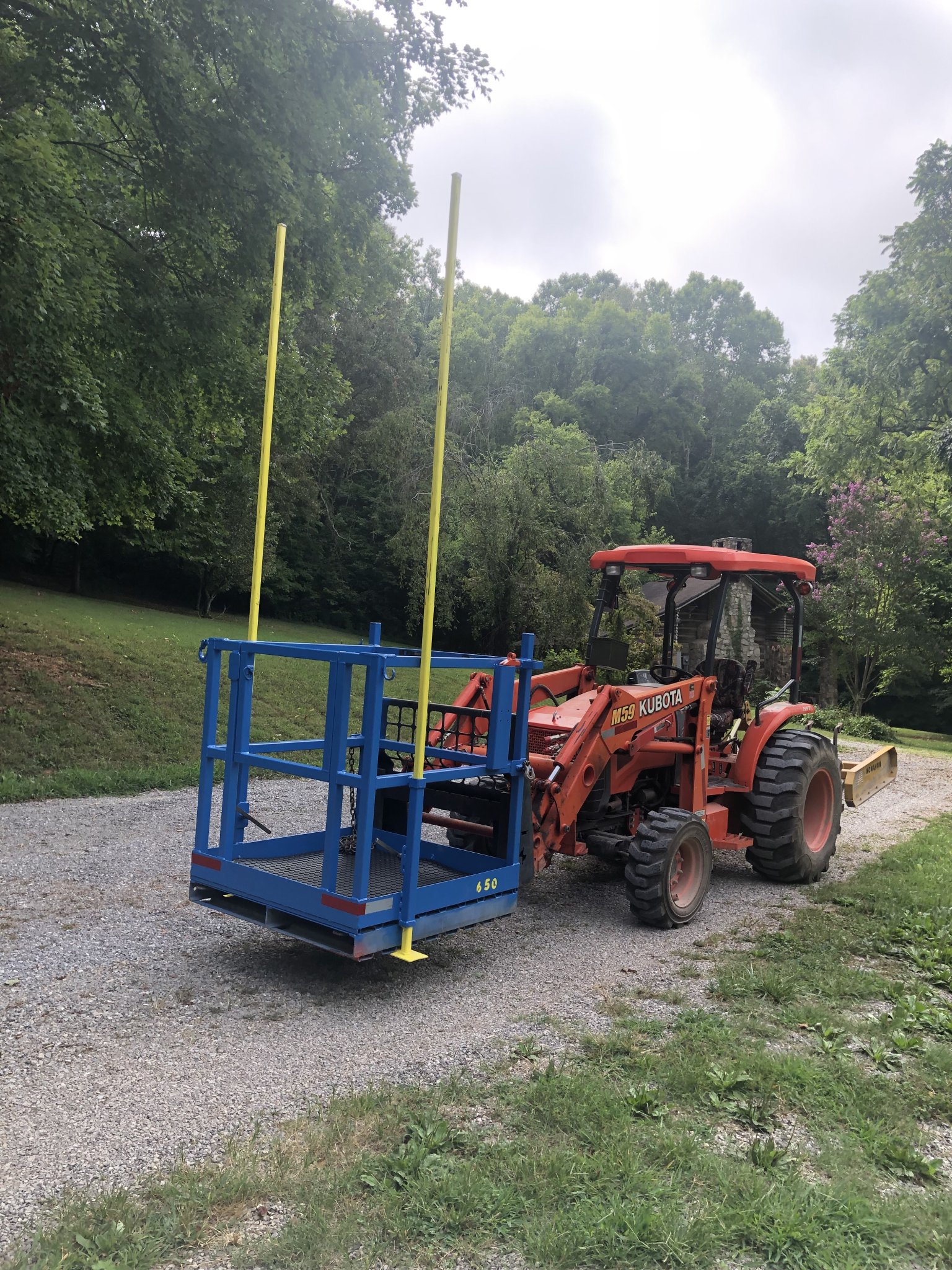 Made my man basket. Study enough to hold tools and chainsaw. Even use it for sawhorses. Wife is a good operator when trimming trees. Made adjustable safety poles to support the basket it case of hydraulic failure.