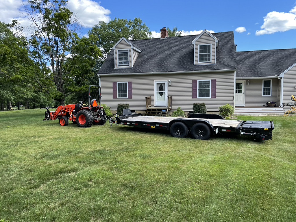 The last picture is me messing around with my little Karavan 5x8 landscaping trailer just to see if it would even fit. According to the brouchure on the tractor I'm exactly at the limit of the trailer at 1600 pounds.