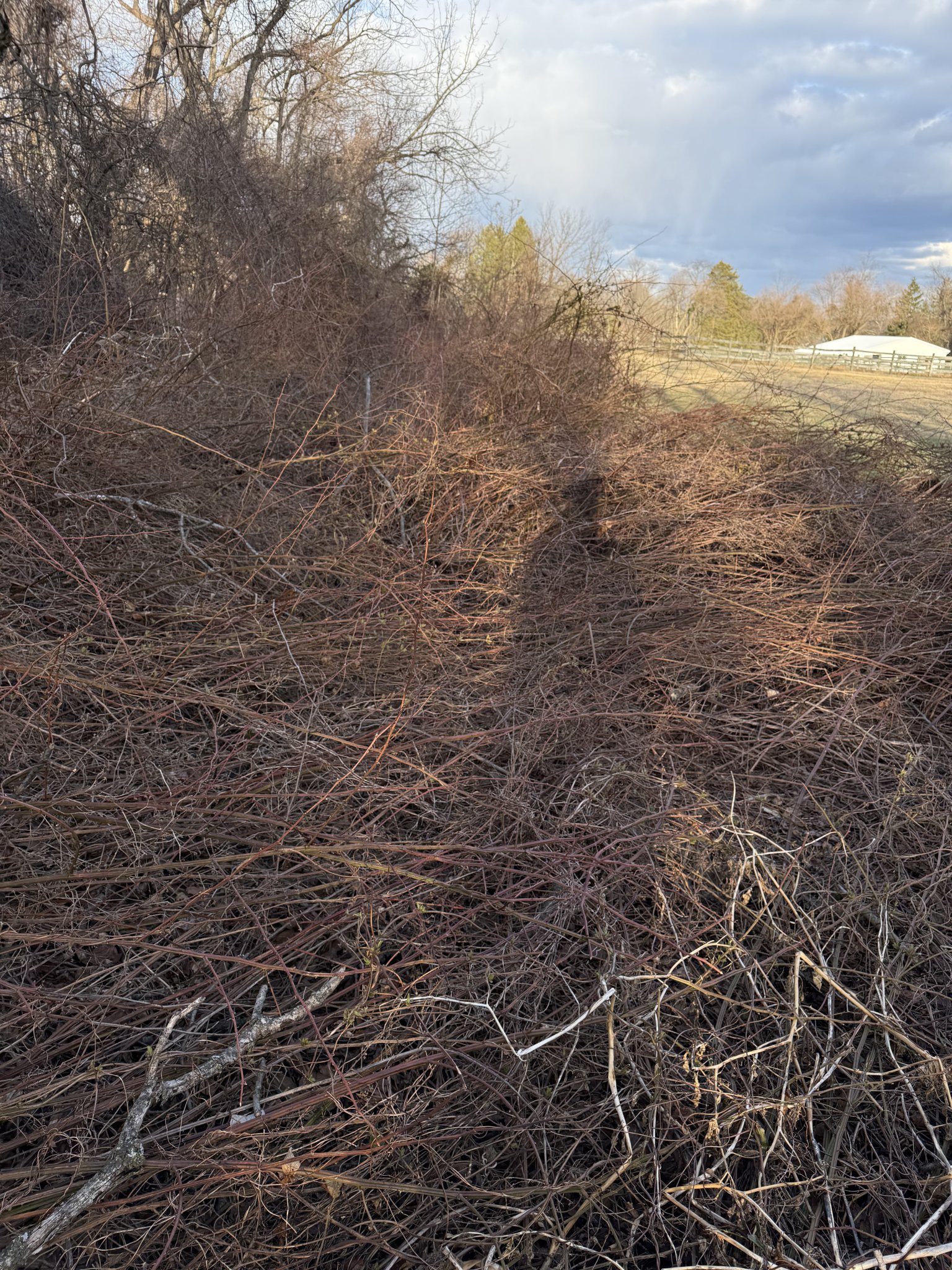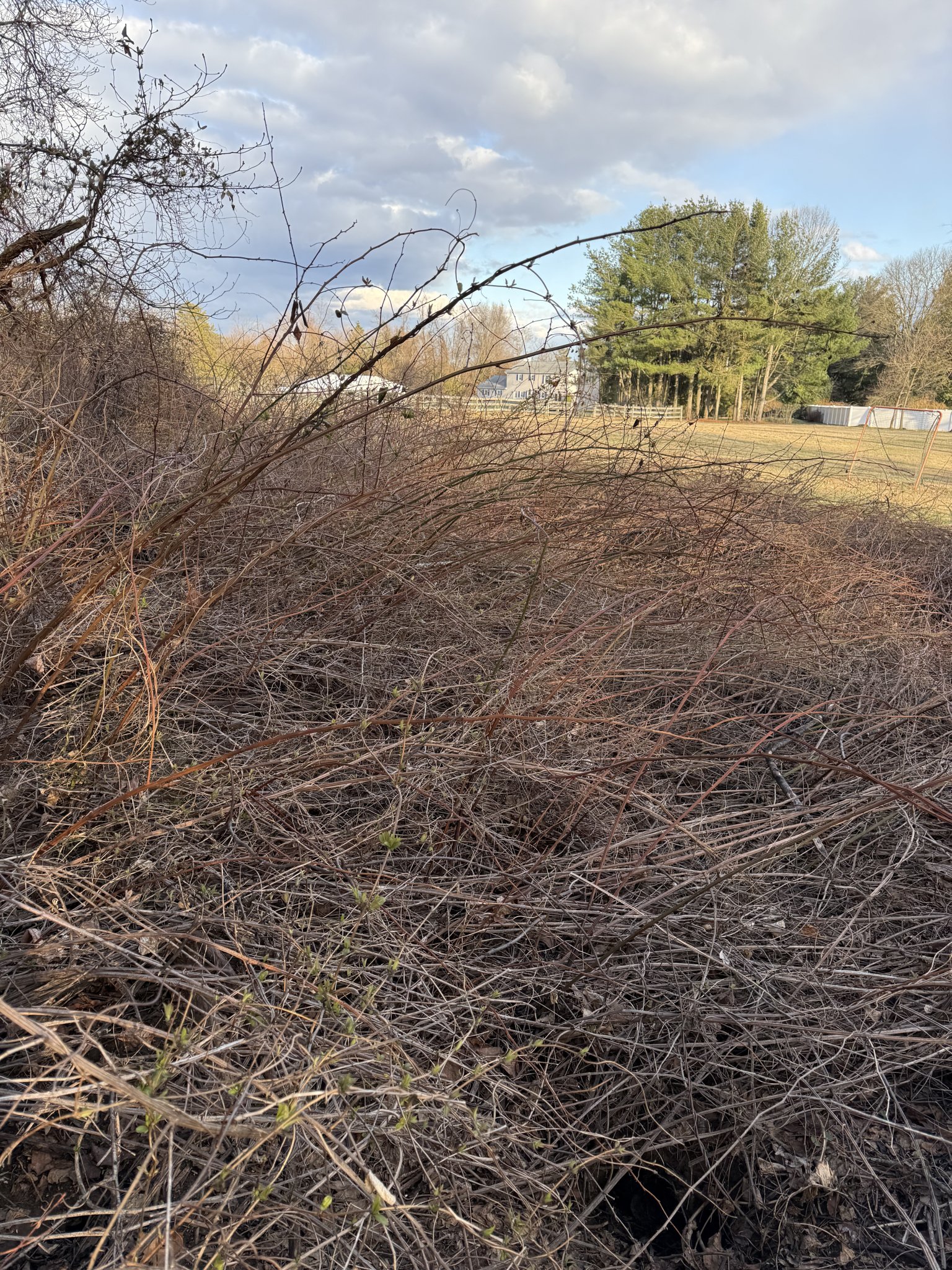 There are also patches of low lying brush and pricker bushes. My neighbor has a brushhog he said I could borrow. Would that cut through this kind of vegetation?