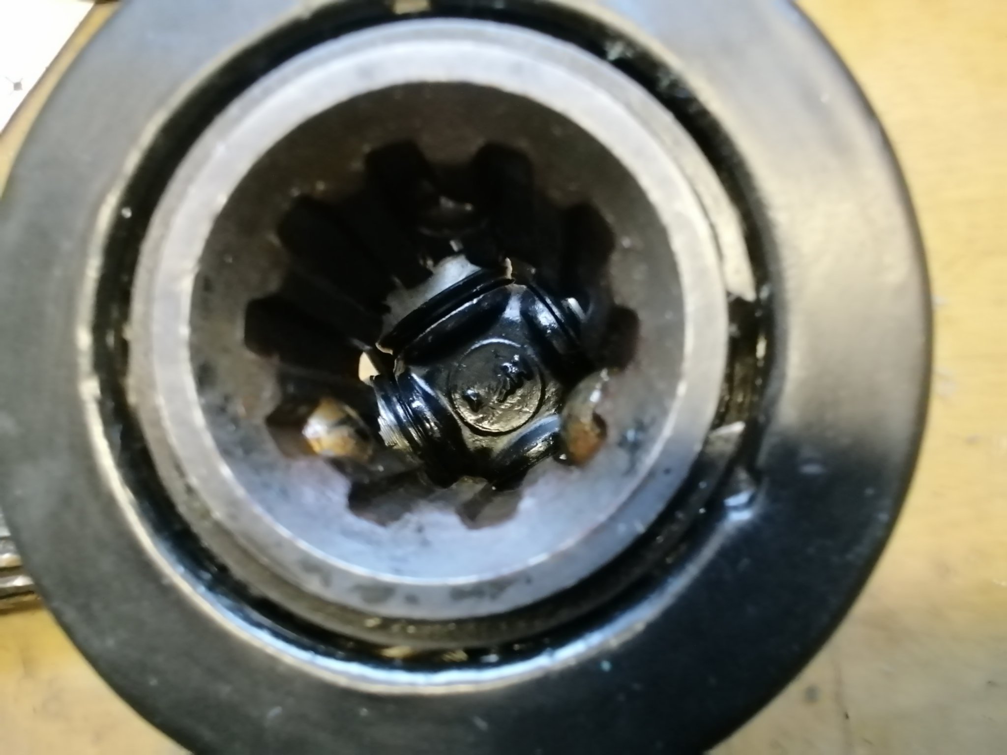 Once you got it off you can disassemble it quite easily. There is a triangular wire spring in the ring part. You have to bend that slightly to get it out of the groove of the splined part. Do not try to get the spring out of the ring. Don't ask