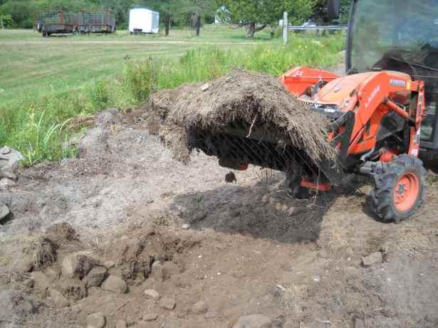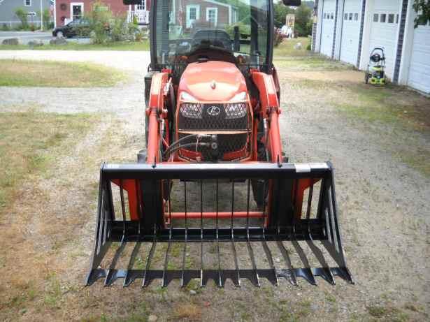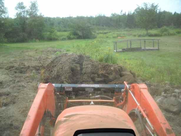 What I do is tilt the bucket to about a 60 - 75 degree angle and lower the bucket until the front tires are off the ground. Then I tilt the bucket back and forth to get the bucket teeth digging into the ground. After I get the bucket dug in a few inches I tilt the bucket to pry the rocks out of the ground. I do this until I have pried enough rocks out of the ground to make more than a full bucket load of rocks. Then I back drag the rocks into a pile that I can get the bucket under. I approach the pile with the tractor in low range with the engine at about 2000 RPM. I make sure that the bucket is at about a 15 degree angle and scoop the rocks into the bucket as I am driving slowly into the pile. This has worked well for me as long as the rocks are the size that you can see in the picture I attached previously. If I am working with much larger rocks I use the regular bucket with the piranha bar to dig and pry them out, and then switch to the rock bucket to scoop them up and transport. What method do you use?@armylifer - would you care to describe your technique?