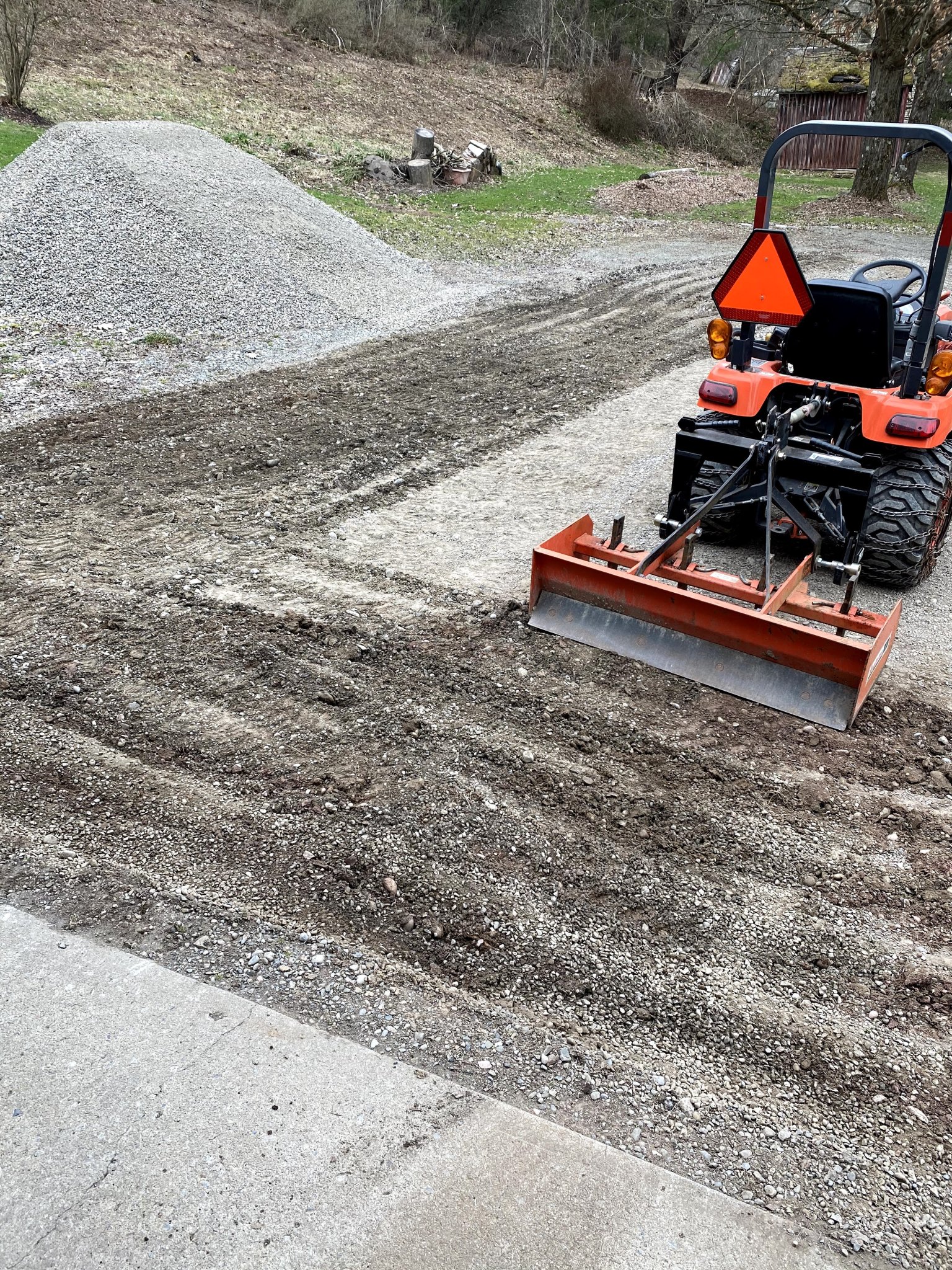 30% of that is distributed with the loader bucket. Have to push into the pile to get a bucket full. Need nearly 100% RPM to help the tractor do that. Rest is pulled around with a box blade.
