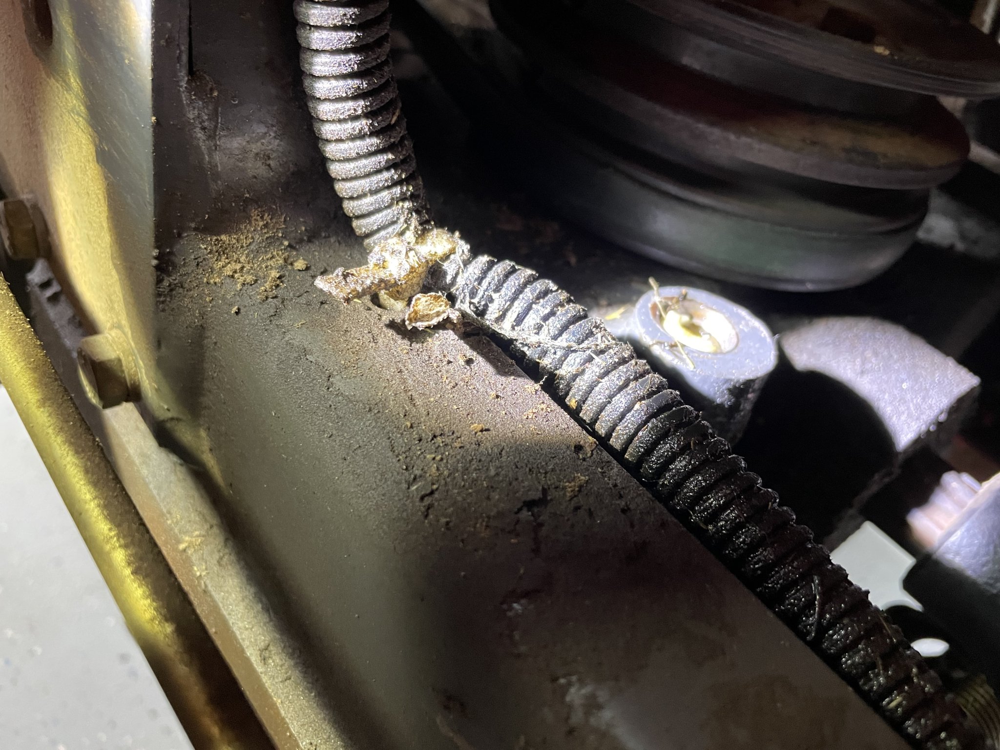 I've not noticed any burnt oil smells to support the belt slipping and the belt really doesn't look oil contaminated. I did notice when I put away the mower the power steering was stiffer than it has been. So, I'm thinking the main heart of the drivetrain, the hydraulic pump / hydrostatic unit might have expelled some oil and is now not functioning properly. Is there any oil directly associated with the PTO pulley unit? Am I on the right track? Might oil have gotten inside the PTO gearbox and it's slipping?
