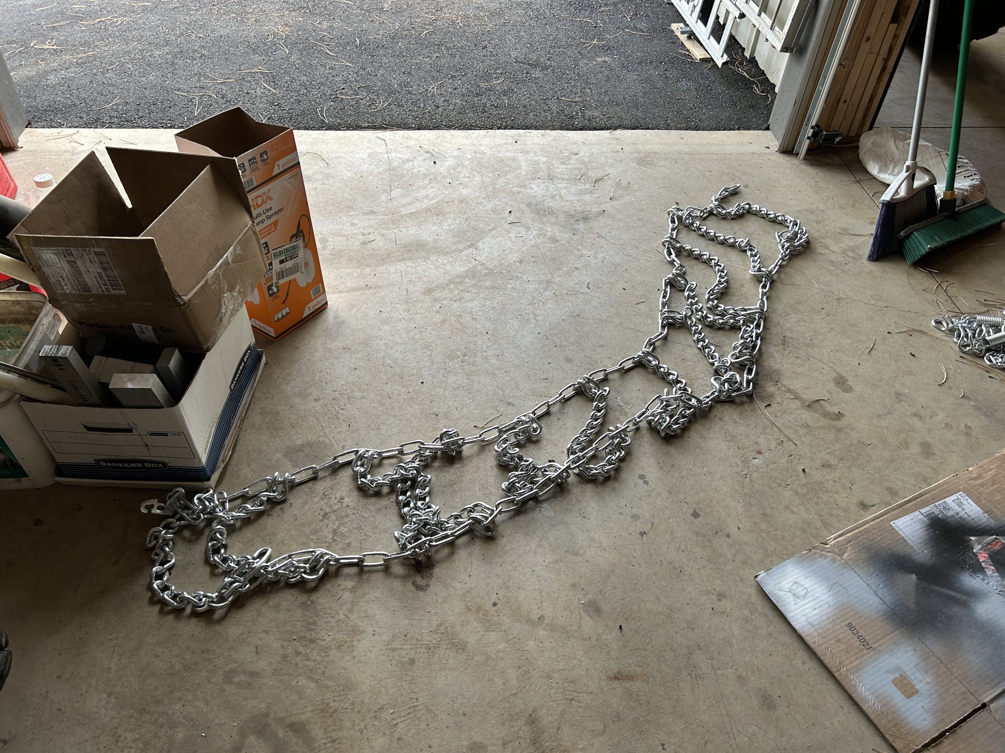 Then I went looking for where to store the chains when not in use (which is virtually all the time). I don't want them outside such that they'd be covered in snow & ice when I *do* need them. All the wall space in my shop is taken. At 42lbs each, a 5gal bucket seems marginal, plus I don't need more stuff taking up floor space.