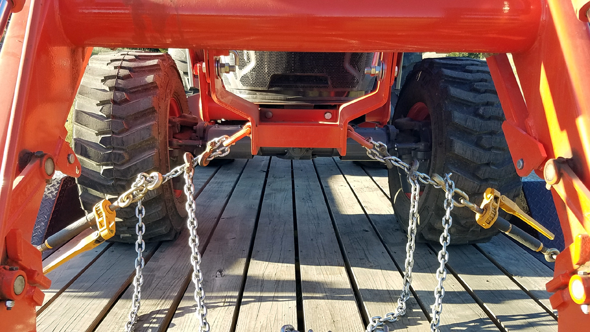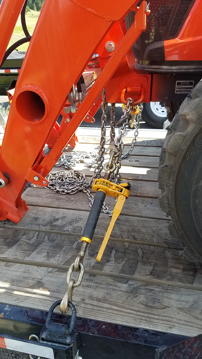 However, I find that there are no good tie down points on the front and back of the tractor to connect the tiedown chains to.