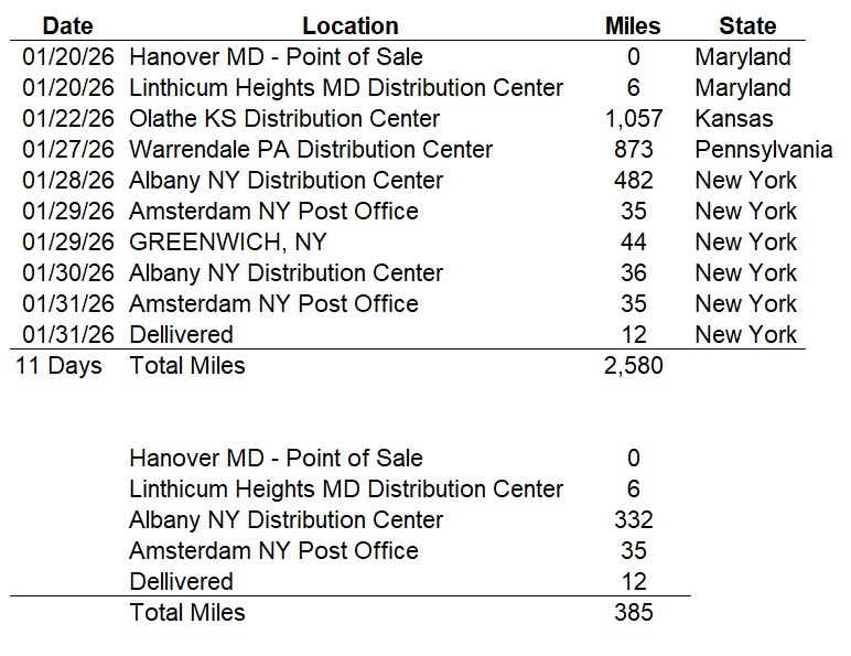 My wife's Chevy has a bad tire pressure sensor so I ordered one from Rock Auto. It was shipped USPS on 1/20/26. It originated in Maryland, went to Kansas, Pennsylvania, NY, NY, NY, NY, NY, and finally to me today 1/30/26. A total of 2,580 miles and took 11 days to get here. Good thing I didn't need it right away.
